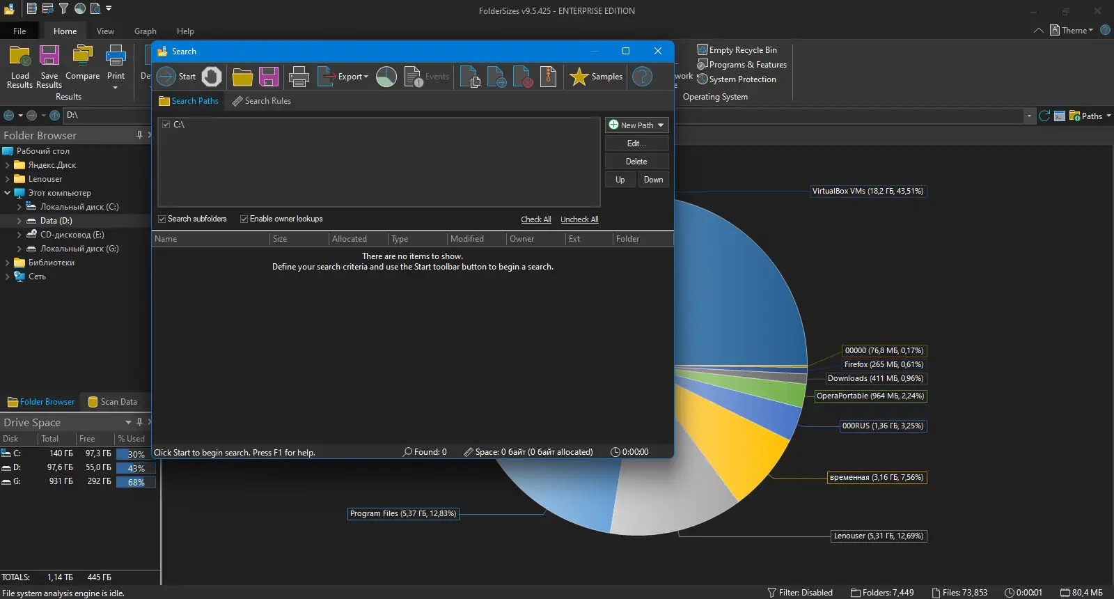 - Подробные отчёты о размере папок и файлов, включая визуализацию и диаграммы
