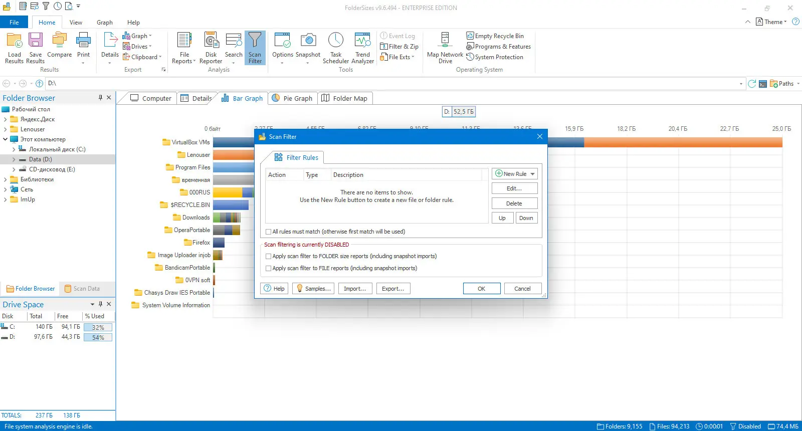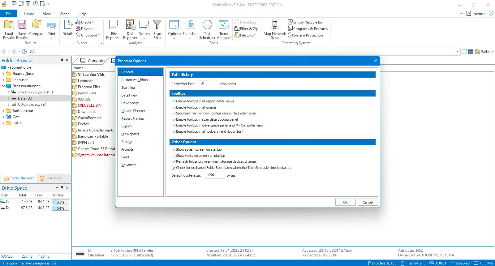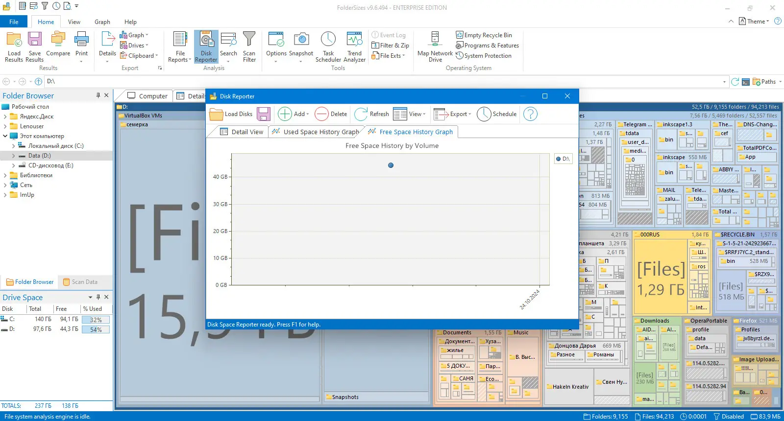 - Глубокий анализ дискового пространства с подробными отчетами и визуализациями