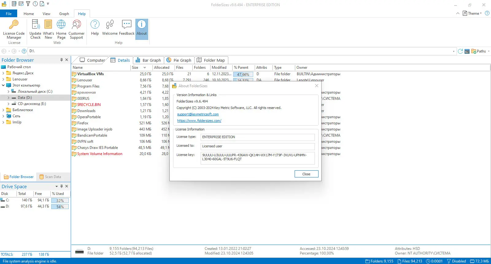 FolderSizes — мощная утилита для анализа дискового пространства, которая позволяет определить объем свободного и используемого места на жестком диске. Используя современное отображение данных и диаграммы, программа помогает быстро выявить крупные файлы, папки и типы данных. Это решение идеально подходит для оптимизации хранения, освобождения места и повышения эффективности эксплуатации дисковой подсистемы.