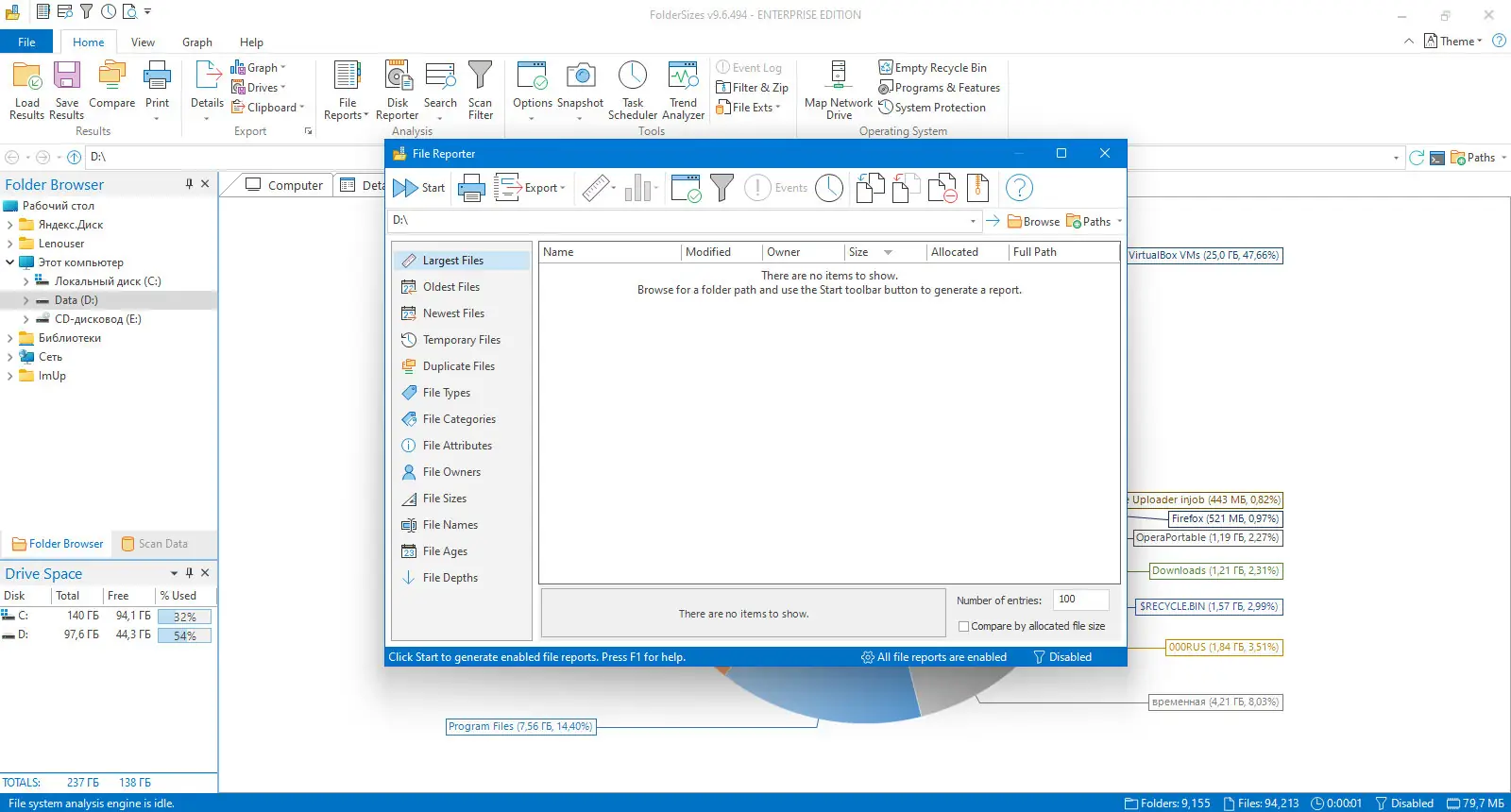 Благодаря подробным отчетам и удобному интерфейсу, вы сможете проследить распределение файлов по типам, владельцам, атрибутам и возрасту. Инструмент позволяет находить дублирующиеся файлы, временные данные и старые документы, что значительно ускоряет очистку диска без риска удалить важные системные компоненты. Кроме того, программа поддерживает автоматическое планирование заданий и экспорт данных в различные форматы для последующего анализа или отчетности.