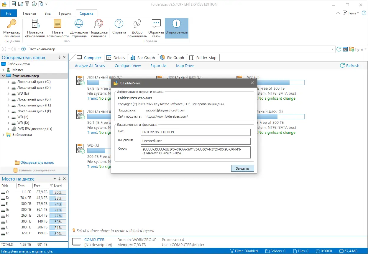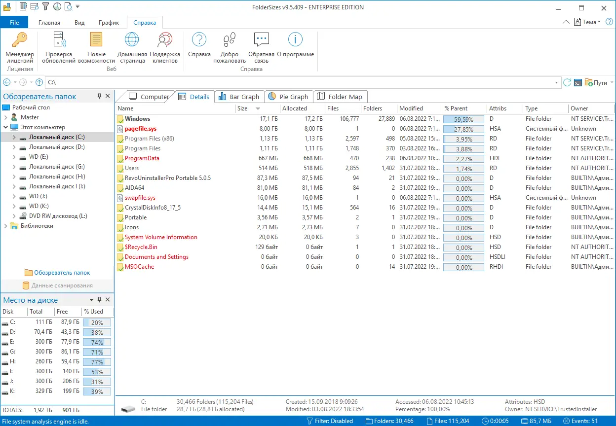 Программа FolderSizes — это мощный инструмент для анализа использования дискового пространства. Она позволяет определить объем свободного места на жестком диске, предоставляет подробную информацию о размере папок и файлов по каждому разделу, а также использует диаграммы для наглядного представления данных. Благодаря данному продукту можно быстро находить файлы, удаление которых поможет освободить пространство без риска повлиять на работоспособность системы.
