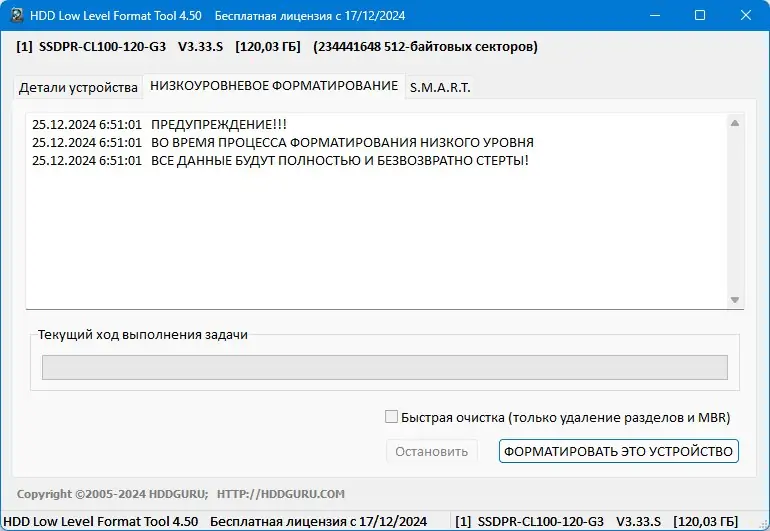 Работа программы особенно актуальна при необходимости подготовки новых накопителей, устранения ошибок загрузки, восстановлении старых дисков и их полном уничтожении. Обратите внимание, что низкоуровневое форматирование — это мощная процедура, приводящая к безвозвратной потере данных. Поэтому рекомендуется сделать резервное копирование всей важной информации перед использованием. Поддерживаемые языки: русский, английский. Является полностью бесплатной для скачивания и использования, в том числе на системах Windows 7, 8/8.1, 10 и 11, а также на x32 и x64 bit архитектурах.