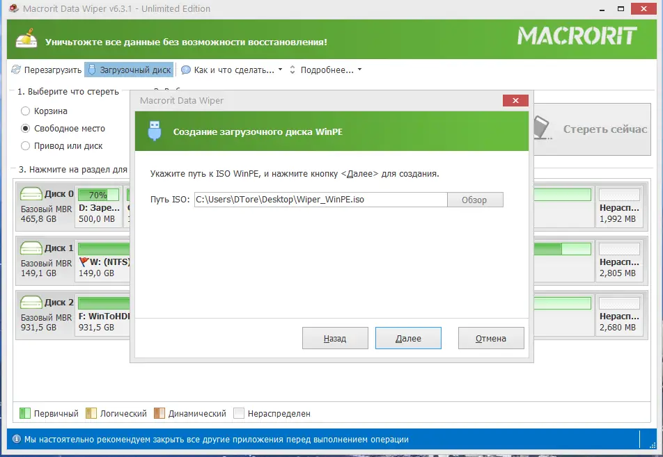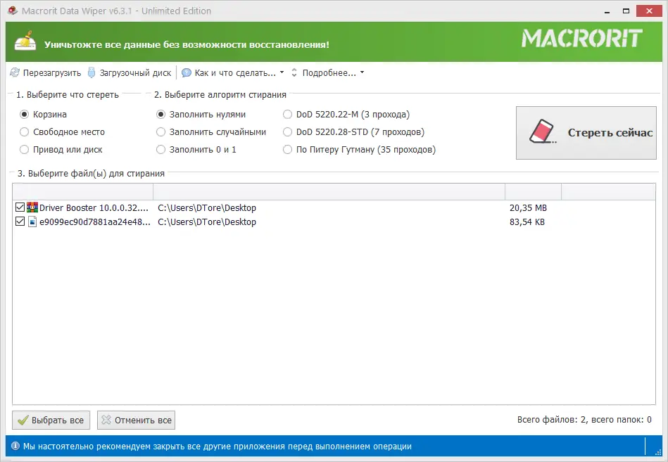 - Полное уничтожение данных на дисках или отдельных разделах, включая USB и внешние накопители.