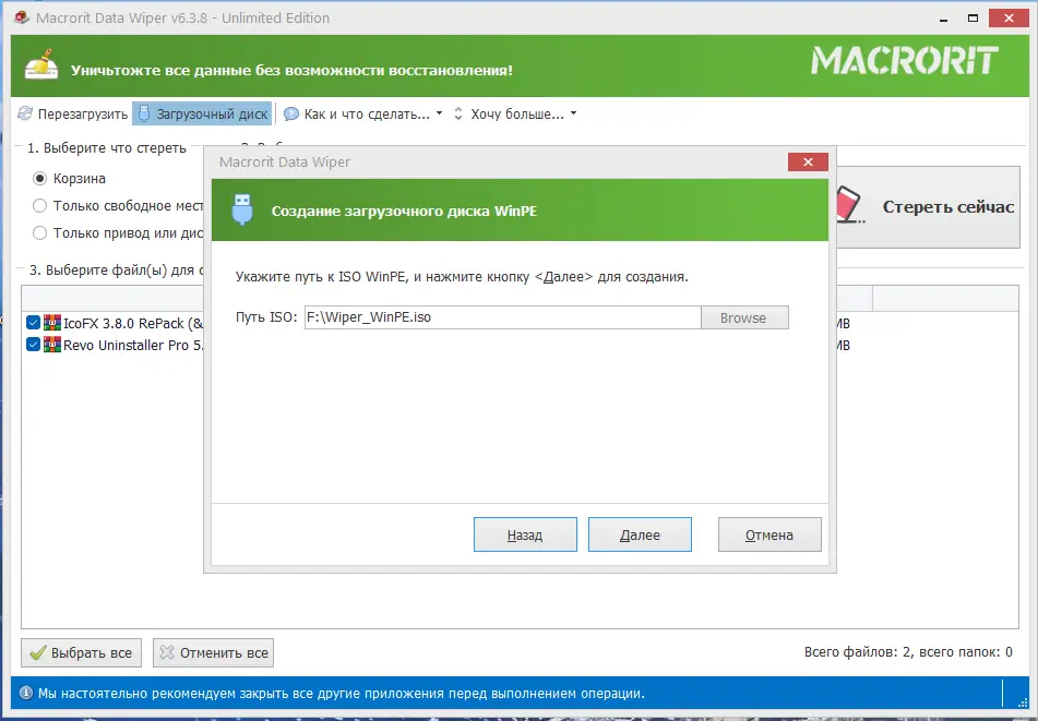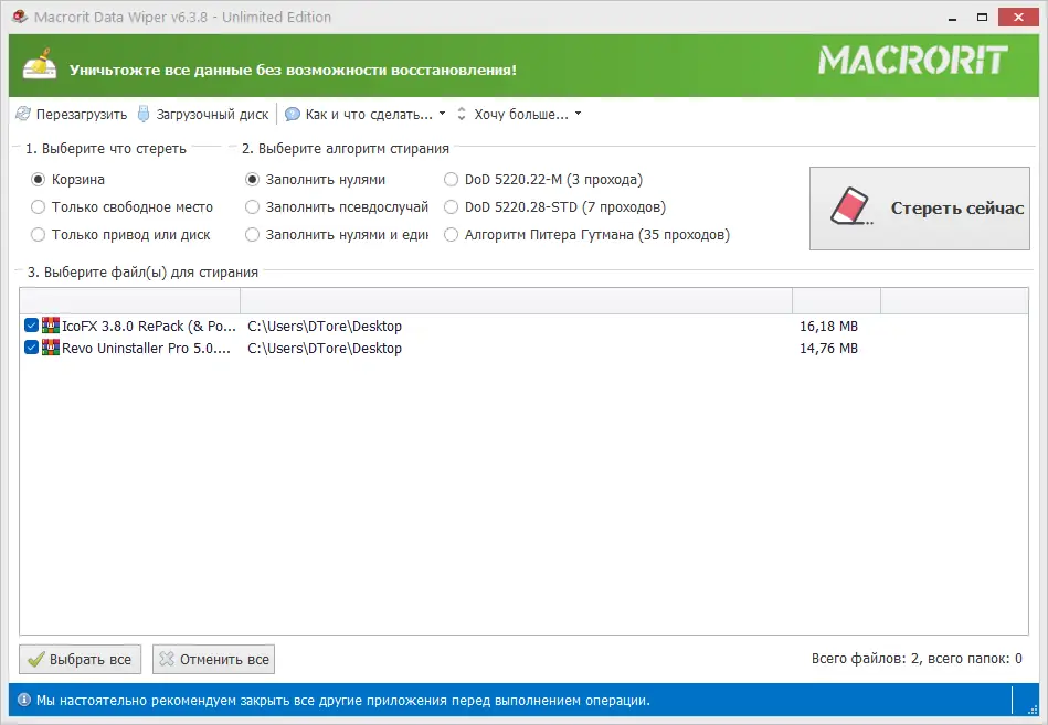 - Полное стирание данных с дисков, USB-носителей и внешних устройств