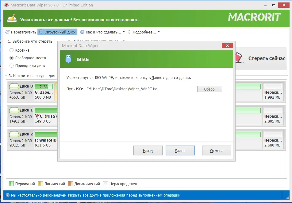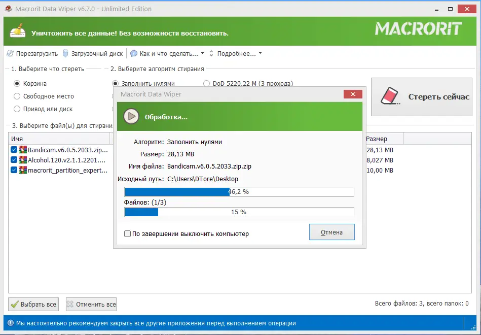 - Полное уничтожение данных на дисках, разделах, USB и внешних накопителях.