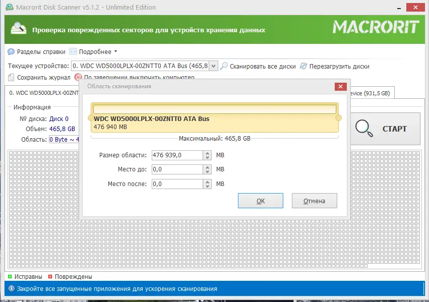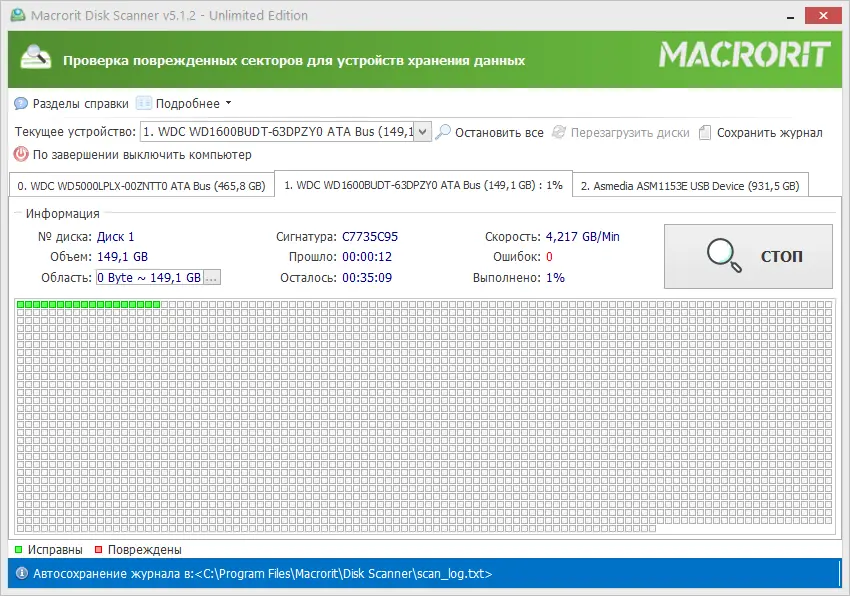 Программа позволяет протестировать любой тип накопителя, показывая состояние хороших и поврежденных секторов. Это важное средство для оценки качества вашего винчестера и принятия решения о необходимости замены или восстановления устройства. Простым выбором диска и запуском сканирования вы получите полную информацию о его состоянии. Также есть возможность указать определённый диапазон секторов для анализа конкретных участков диска.