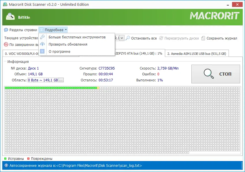 Бесплатная программа для быстрого и эффективного тестирования жестких дисков и выявления битых секторов.