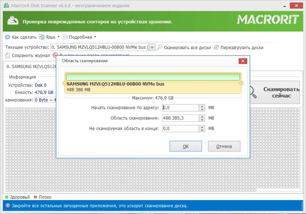 Программа отличается высокой точностью диагностики и удобным интерфейсом, что делает процесс проверки диска максимально комфортным и быстрым. Возможность выбора конкретного диапазона секторов позволяет сосредоточиться на наиболее проблемных областях.