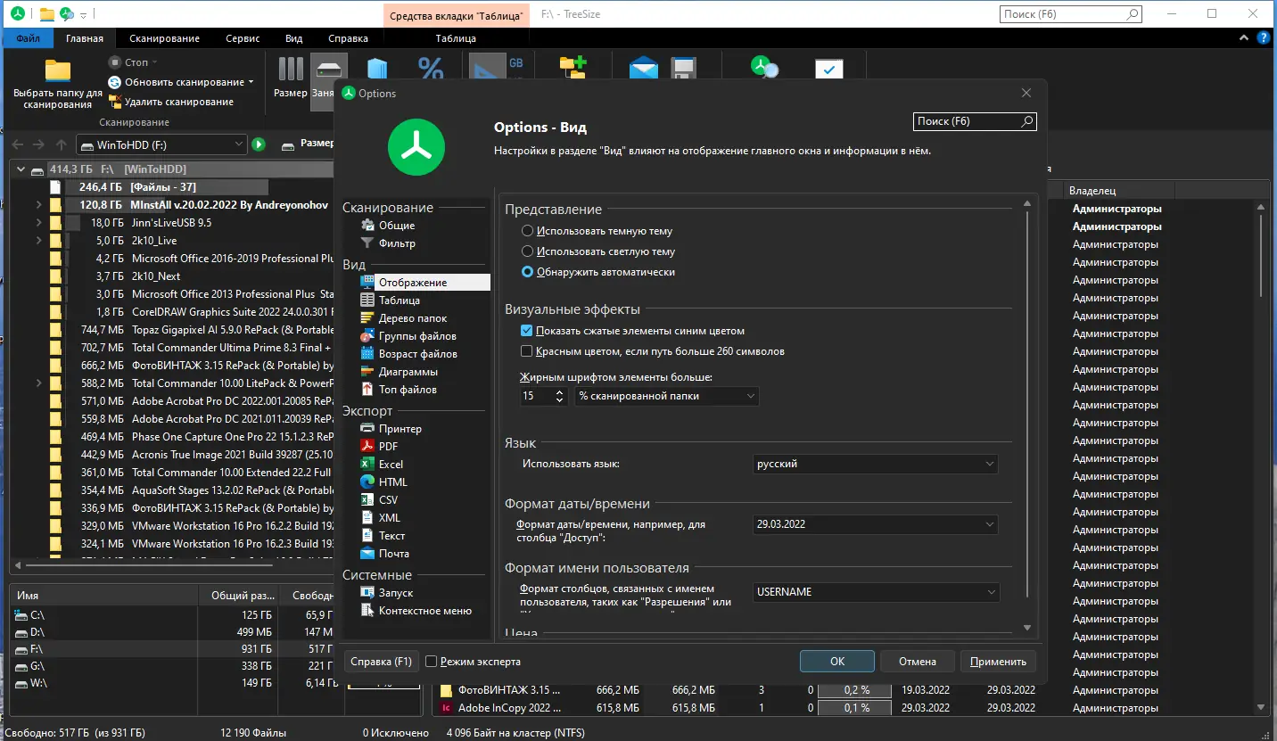 Программа предоставляет детальные сведения о папках и файлах, включая владельцев, права доступа, дату последнего использования, сжатие NTFS и другие важные параметры. Через встроенный универсальный поиск можно находить старые, крупные или повторяющиеся файлы, а затем перемещать, удалять или экспортировать результаты. Возможность сканирования сетевых ресурсов, таких как FTP, WebDAV и SharePoint, а также мобильных устройств делает TreeSize универсальным инструментом для комплексного управления дисковым пространством.