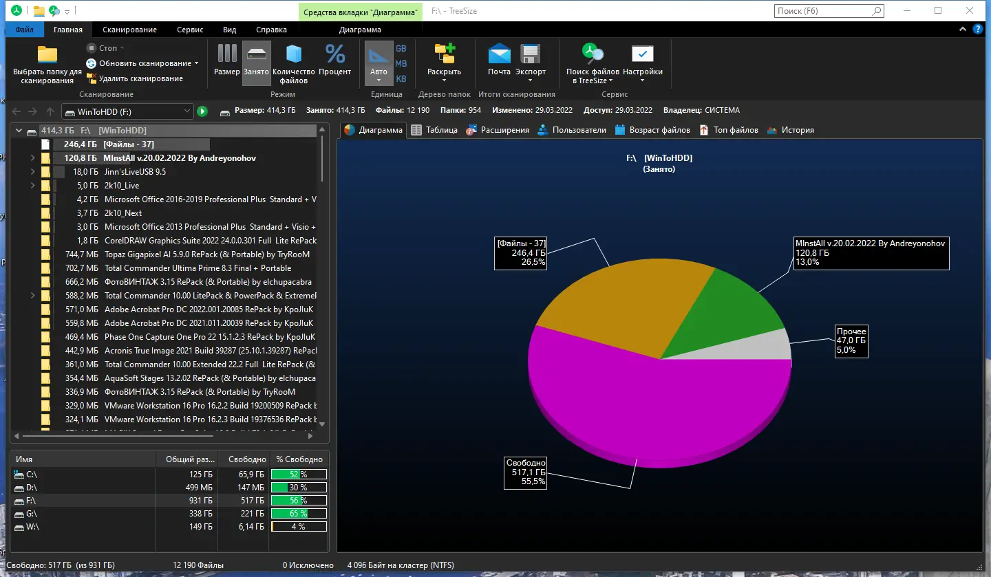 - Графическое отображение использования диска в виде дерева, круговых и гистограммных диаграмм