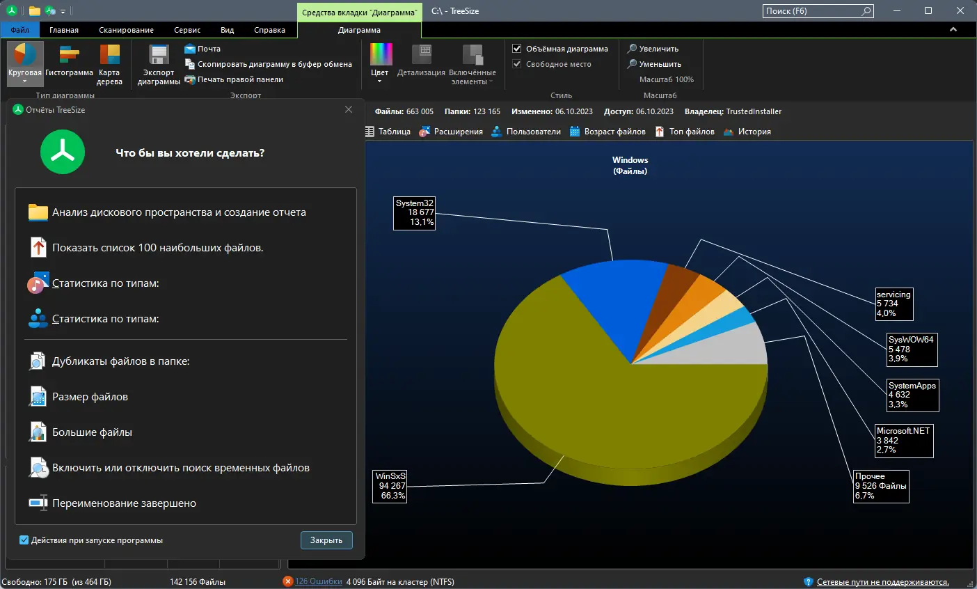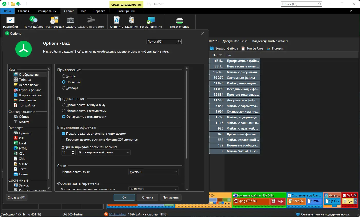 Дополнительные функции включают визуализацию данных в виде диаграмм и древовидных карт, фильтрацию по пользователям или типам файлов, а также поддержку работы с удаленными серверными ресурсами и облачными хранилищами. Расширенная поддержка NTFS позволяет учитывать сжатия, жесткие ссылки и альтернативные потоки данных, а интеграция с проводником Windows обеспечивает быстрый доступ и управление файлами прямо из контекстного меню.