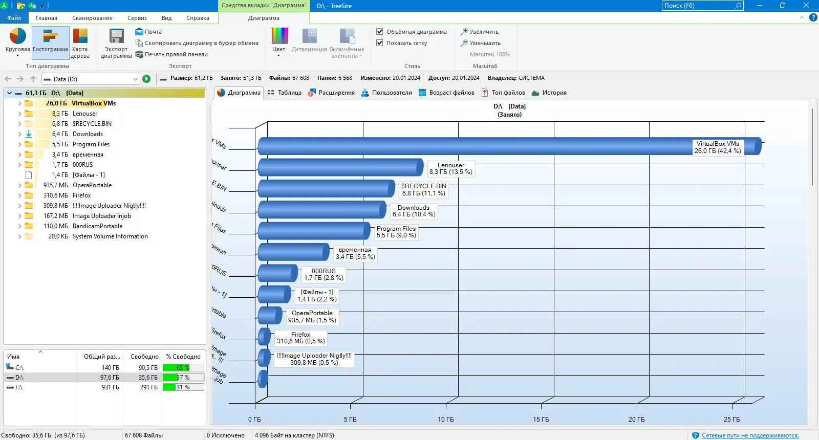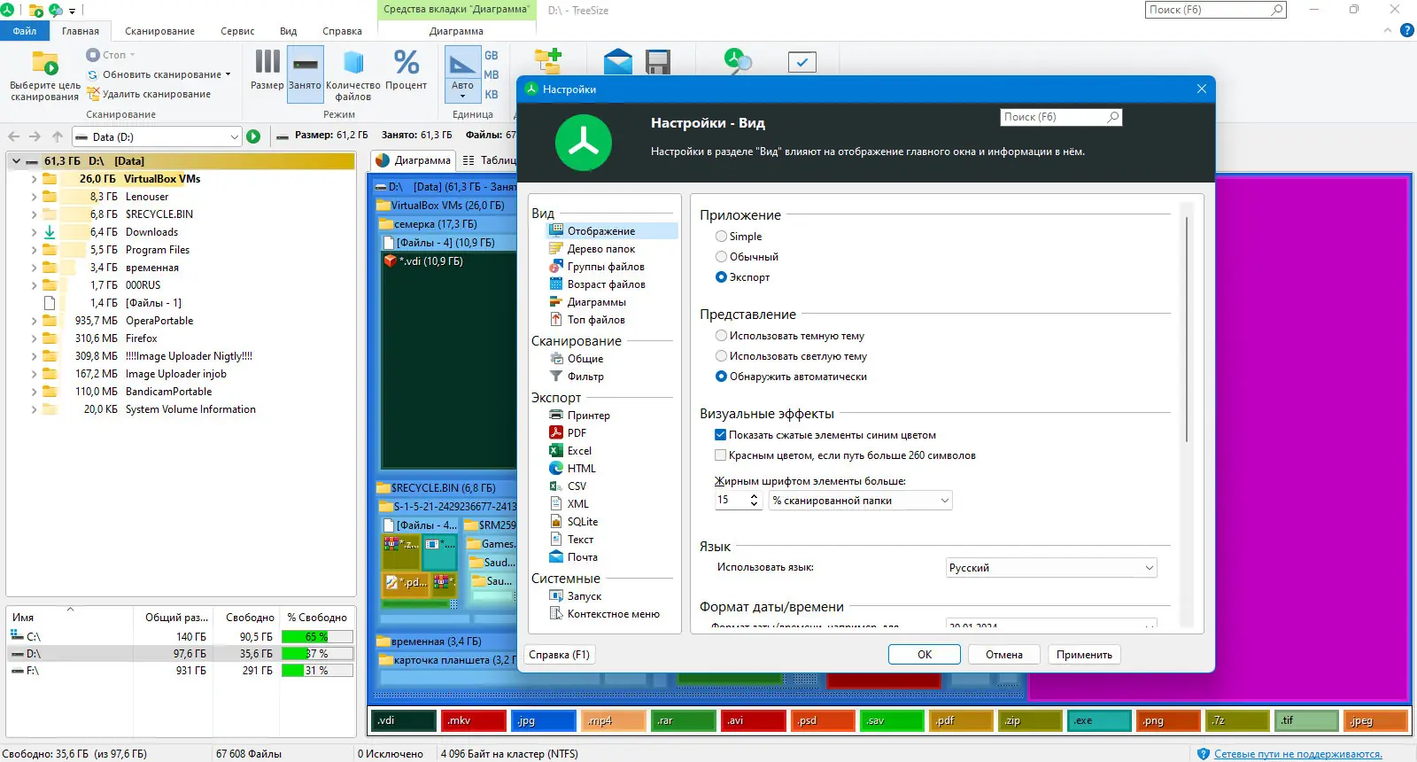 - Эффективное управление дисковым пространством и создание отчетов с наглядной визуализацией (круговые диаграммы, гистограммы, древовидные карты)