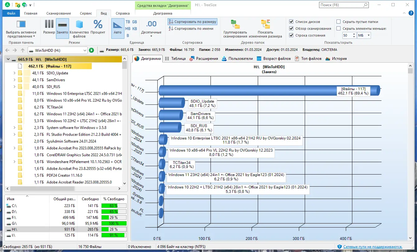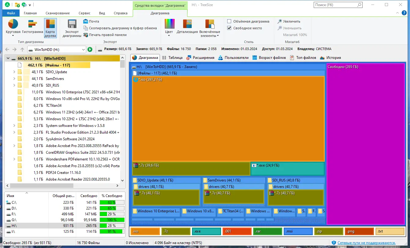 - Графическое отображение использования диска с помощью диаграмм и древовидных карт