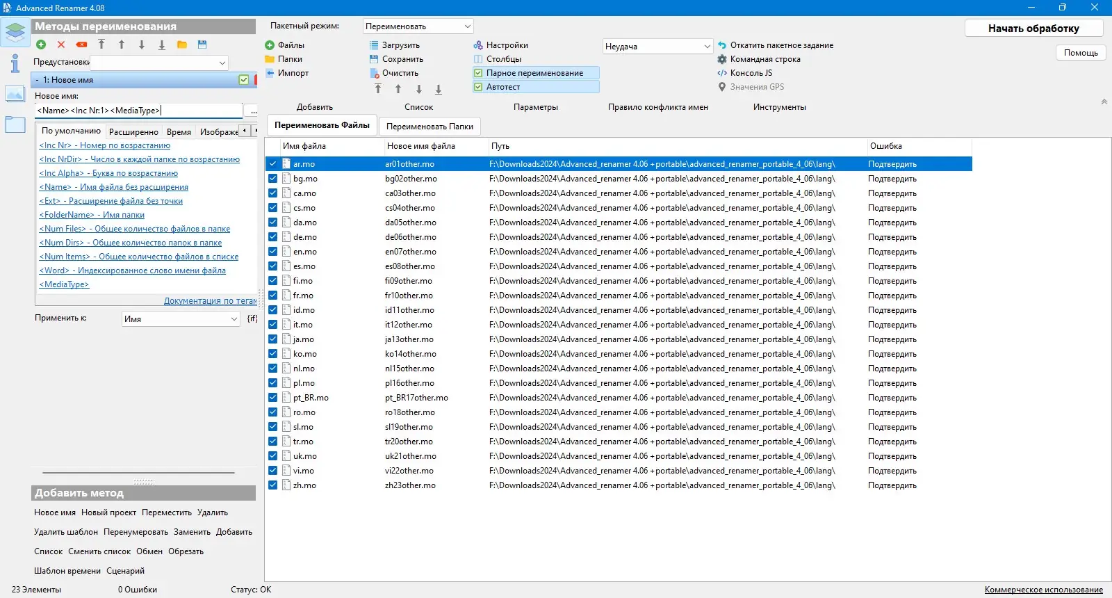 Advanced Renamer предоставляет пользователю инструменты для быстрого и гибкого переименования файлов, а также изменения системных атрибутов. В новых версиях добавлена поддержка различных тегов и форматов мультимедийных файлов, что позволяет автоматически формировать имена с учетом метаданных, например ID3 для музыки или EXIF для изображений. В интерфейсе реализована возможность предварительного просмотра новых имен в реальном времени, что значительно облегчает настройку операций. Помимо стандартных процедур переименования, программа позволяет копировать и переносить элементы, устанавливать временные метки и атрибуты, а также восстанавливать предыдущие задания. Она совместима с различными версиями Windows 7, 8/8.1, 10 и 11 как в x32, так и в x64 Bit, а также имеет портативную версию, которая не требует установки и подходит для использования на различных устройствах.