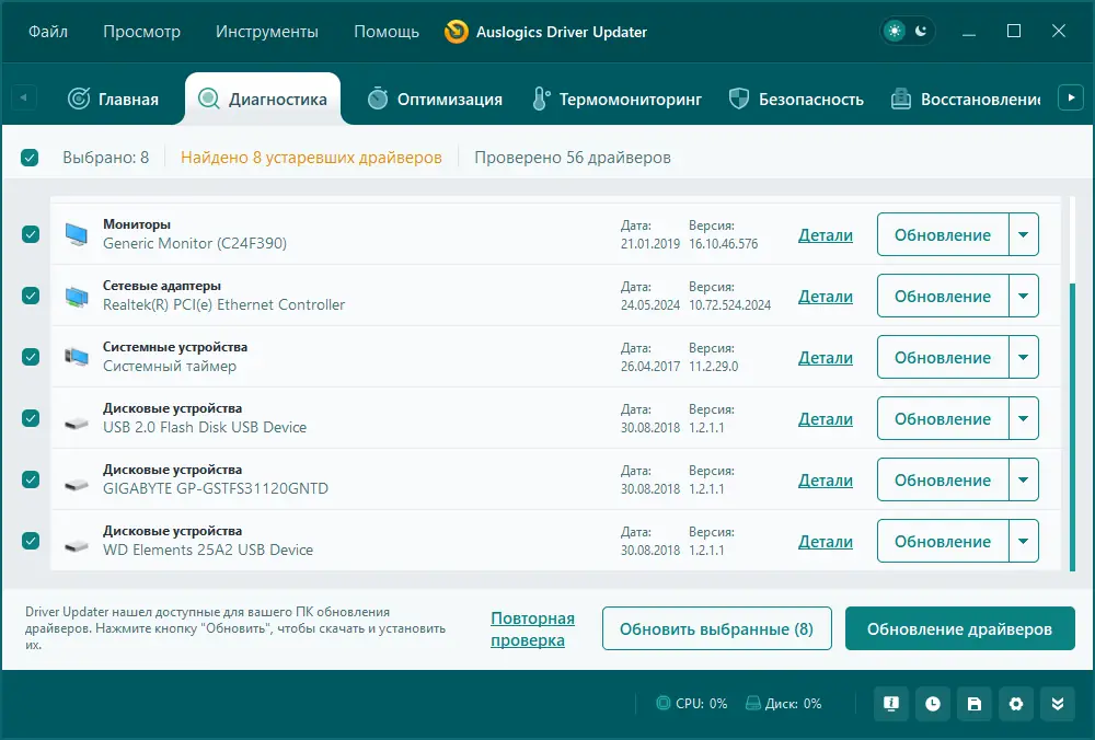 Dieses Tool просканирует ваш компьютер и составит список устройств, для которых доступны обновления драйверов. После этого вы сможете оперативно установить необходимые версии, что значительно сэкономит ваше время и избавит от необходимости ручного поиска обновлений. В программе применяются только официальные драйверы, подходящие для вашего типа и модели устройства, что гарантирует совместимость и безопасность. Перед обновлением создаются резервные копии, что позволяет без проблем откатить изменения, если новая версия вызовет проблемы. Auslogics Driver Updater рекомендуется экспертами за свою надежность, эффективность и безопасность.