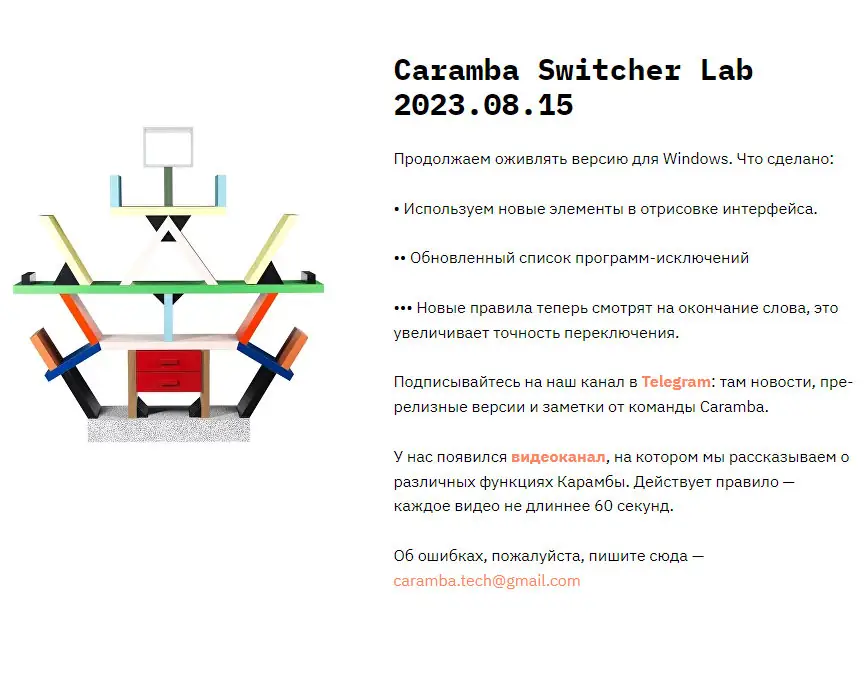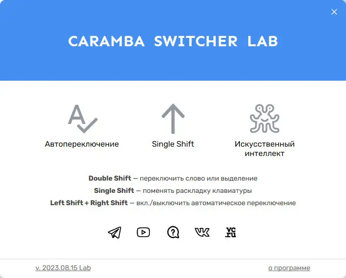 Caramba Switcher — это современное решение для автоматического переключения раскладки клавиатуры, разработанное для комфортной работы с русским, английским и немецким языками. Благодаря умным алгоритмам, программа точно определяет язык набираемого слова и предотвращает досадные ошибки автопереключения. Особенностью является возможностью работы в автоматическом режиме, а также функции отключения при выполнении определённых задач, например, во время игры или вводе паролей. Caramba Switcher Lab версия предназначена для добровольцев, которые хотят участвовать в развитии проекта: отправлять слова-исключения и аббревиатуры, а в результате получать обновленную языковую модель, повышающую точность программы для всех пользователей.
