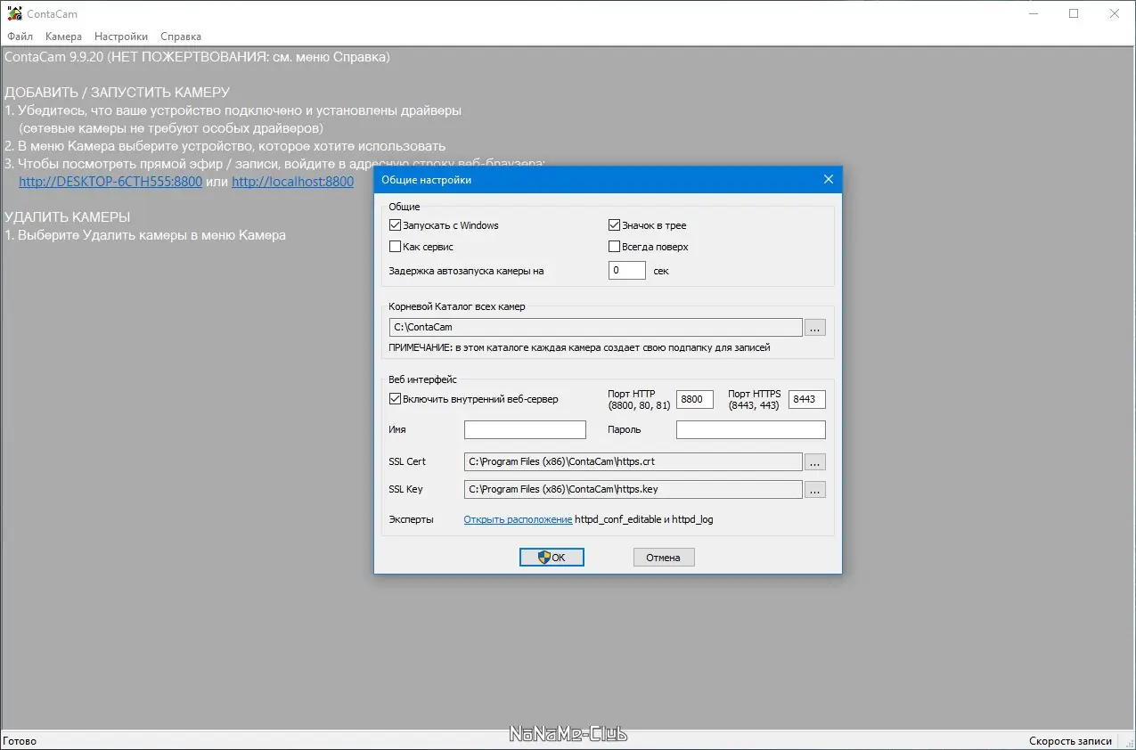 - Настроить параметры безопасности и указать папки для хранения записей.