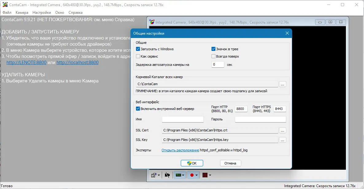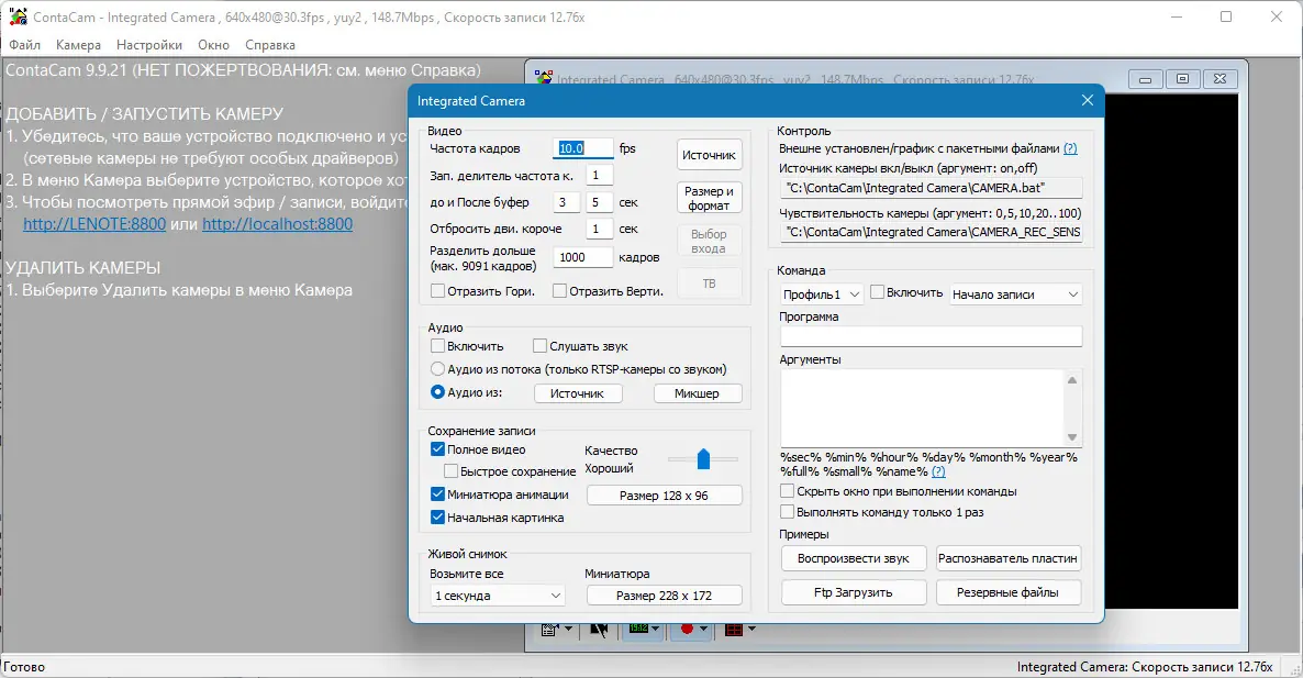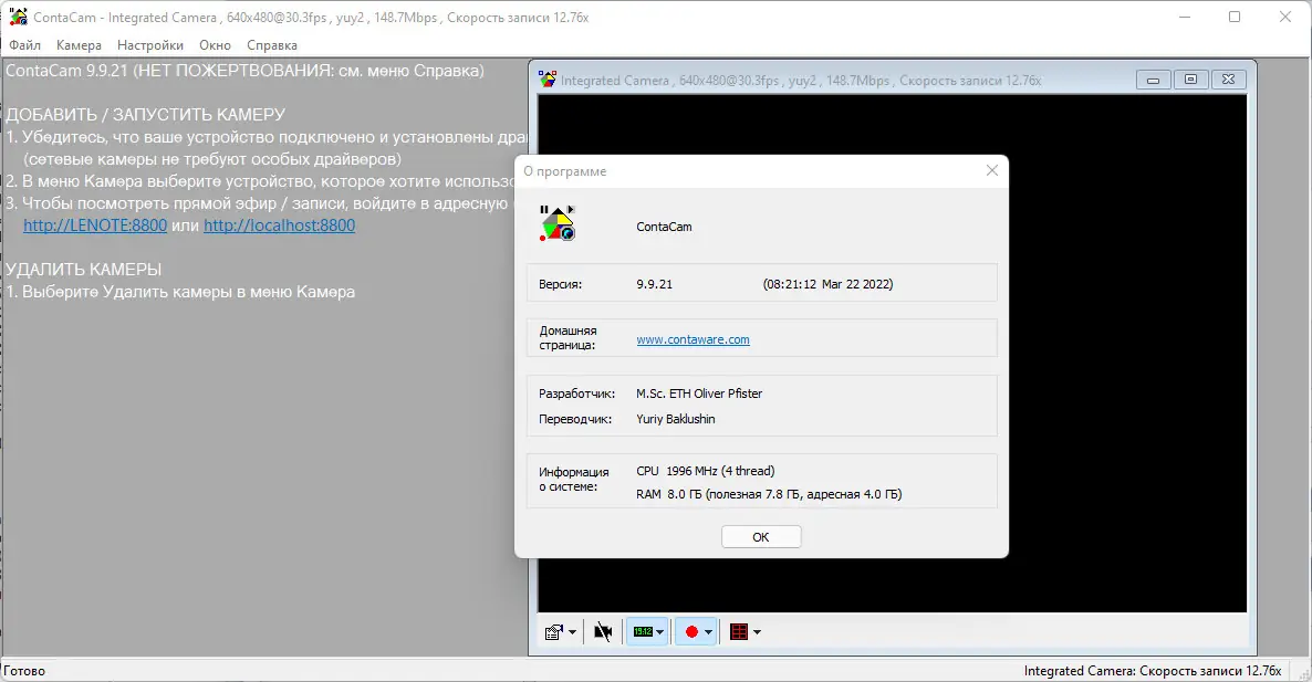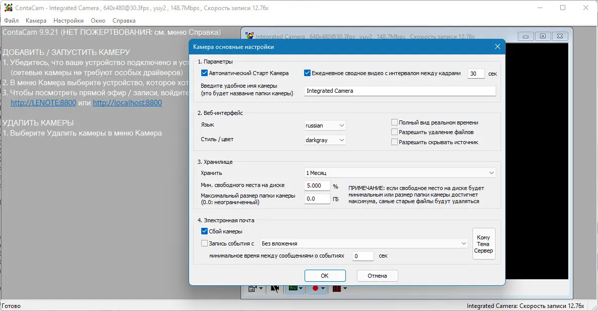 ContaCam — бесплатная и простая в использовании программа для видеонаблюдения и записи с камер, подходящая для Windows 7, 8/8.1, 10 и 11. Предлагает расширенные функции по управлению камерами, записи и отправке миниатюр по сети.