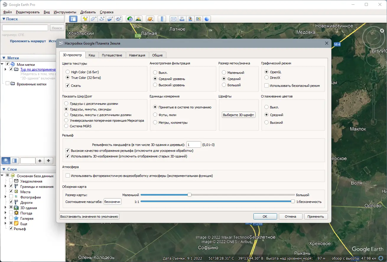 Бесплатная программа для визуализации планеты Земля в 3D-режиме, позволяющая просматривать спутниковые снимки, строения и дополнительные слои данных, а также создавать собственные метки и записывать видео.