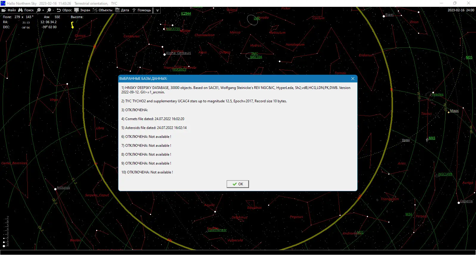 - Большая база данных звезд и объектов неба с возможностью их редактирования и расширения.
