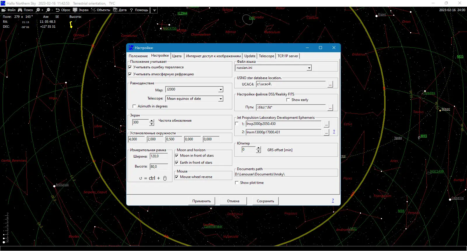Hallo northern sky представляет собой мощное астрономическое приложение, которое позволяет перемещаться по небесной сфере, изучать звездные клады и планеты в режиме реального времени. В базе программы содержится информация о более 4,5 миллионе звезд до величины 12,5 и свыше 30 000 небесных объектов. Благодаря загрузке данных из таких каталогов, как USNO UCAC4 или GSC 1.2, пользователи получают доступ к звездам до шестнадцатой величины. В программу встроены сотни фотографий небесных тел, а возможность быстрого получения изображений из интернета позволяет расширить коллекцию визуальных материалов. Используя контекстное меню и поисковые функции, можно легко находить интересующие регионы и объекты. Интерфейс поддерживается на 21 языке, включая русский, что делает программу доступной и удобной для широкого круга пользователей. Также приложение интегрируется с интерфейсом ASCOM, позволяя управлять телескопом и осуществлять автоматизированные наблюдения.