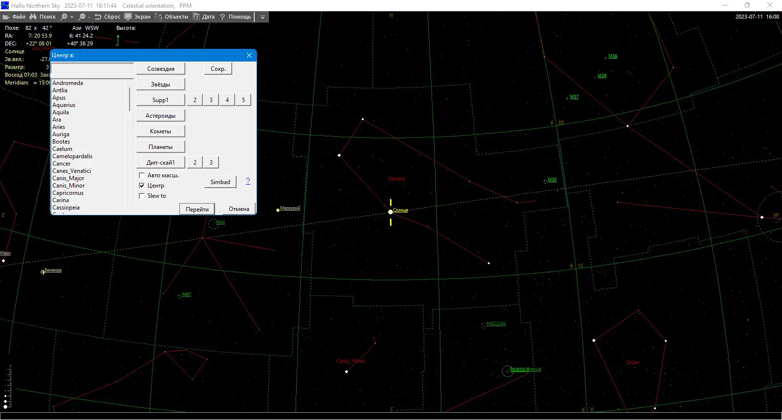 - Перемещение по звездному небу и просмотр созвездий и планет.
