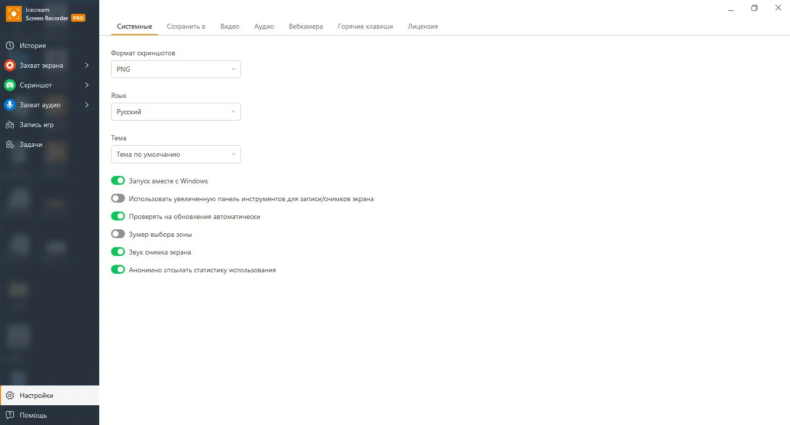- Запись аудио: записывать микрофон и системные звуки одновременно.