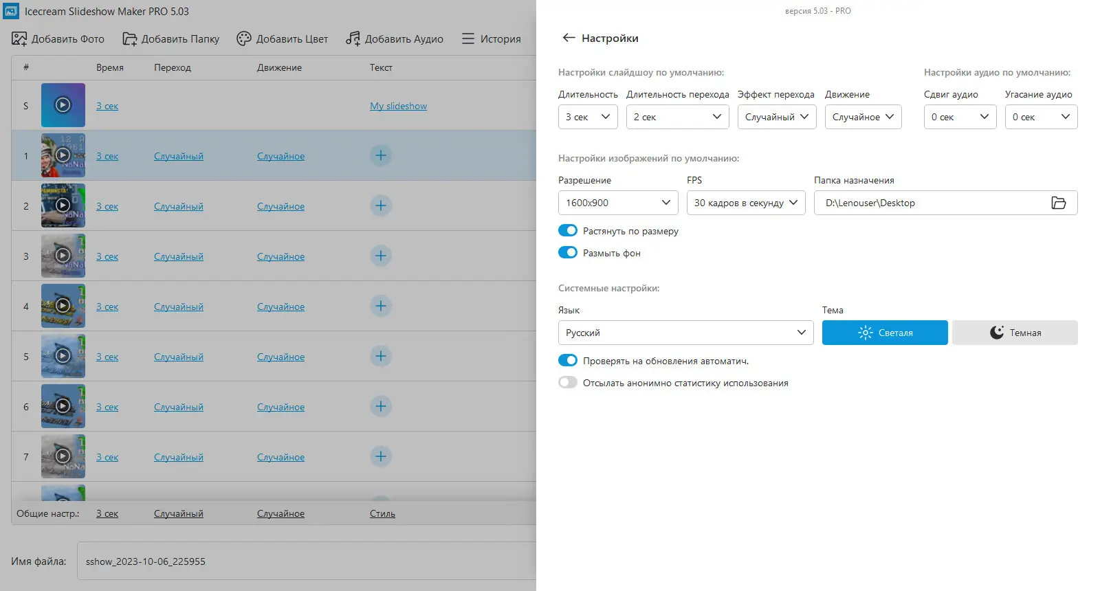 - Контроль времени воспроизведения и эффектов перехода для каждого фото