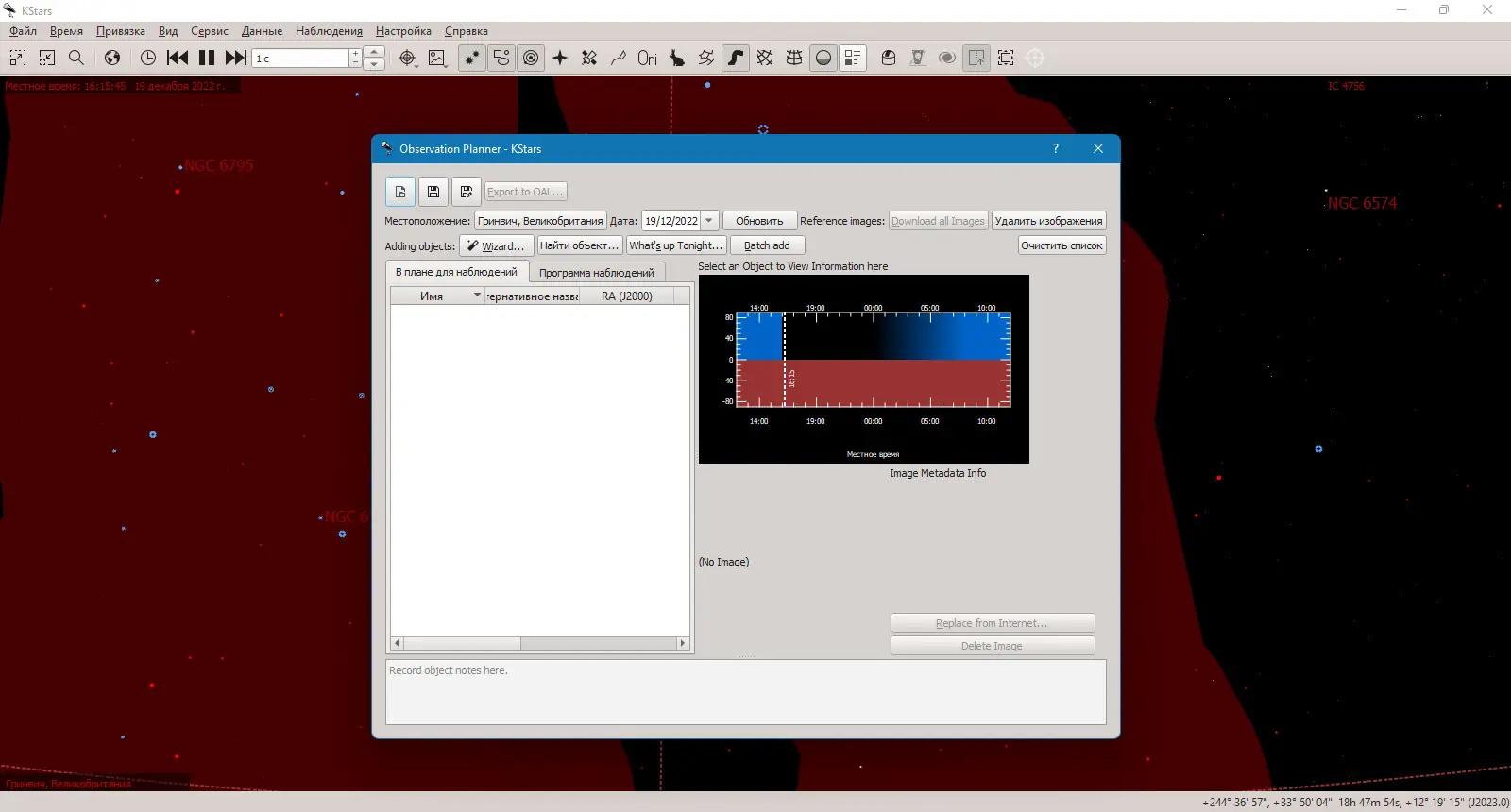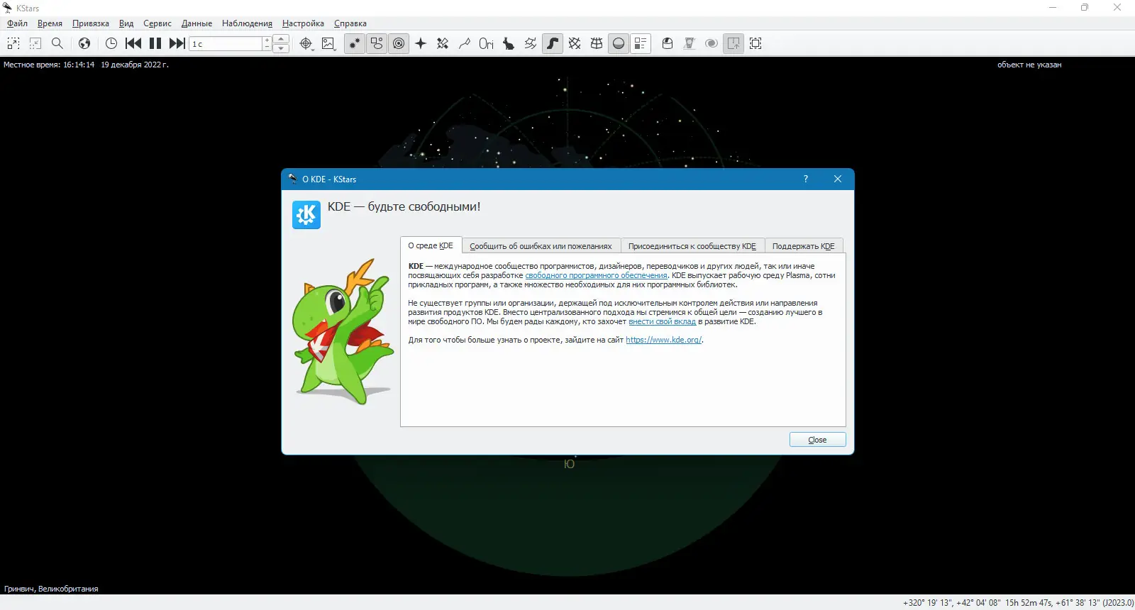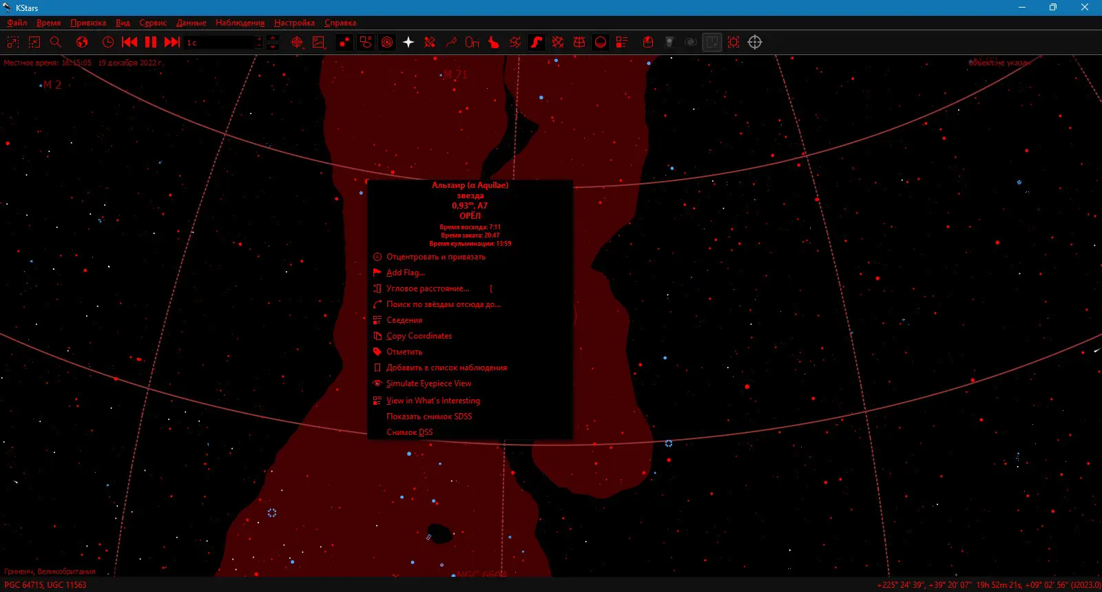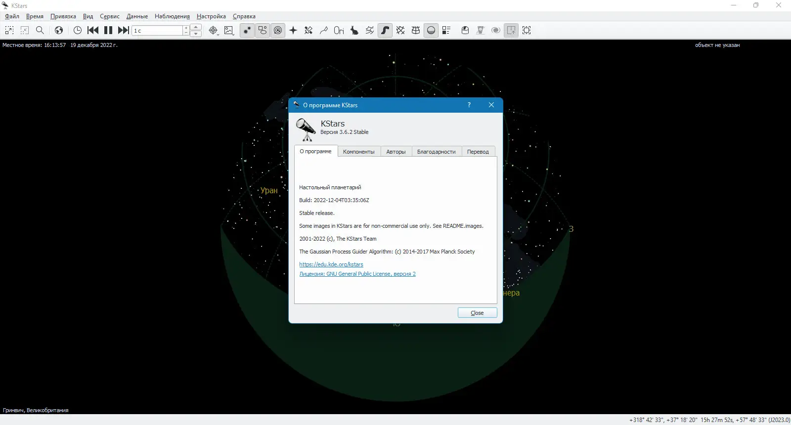 KStars — бесплатное, с открытым исходным кодом кроссплатформенное программное обеспечение для астрономии, предоставляющее точную графическую симуляцию ночного неба с возможностью моделирования окружения из любой точки Земли на любую дату и время.