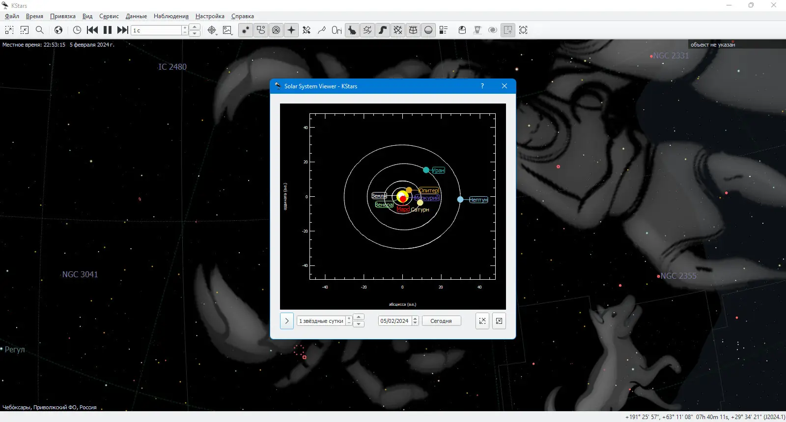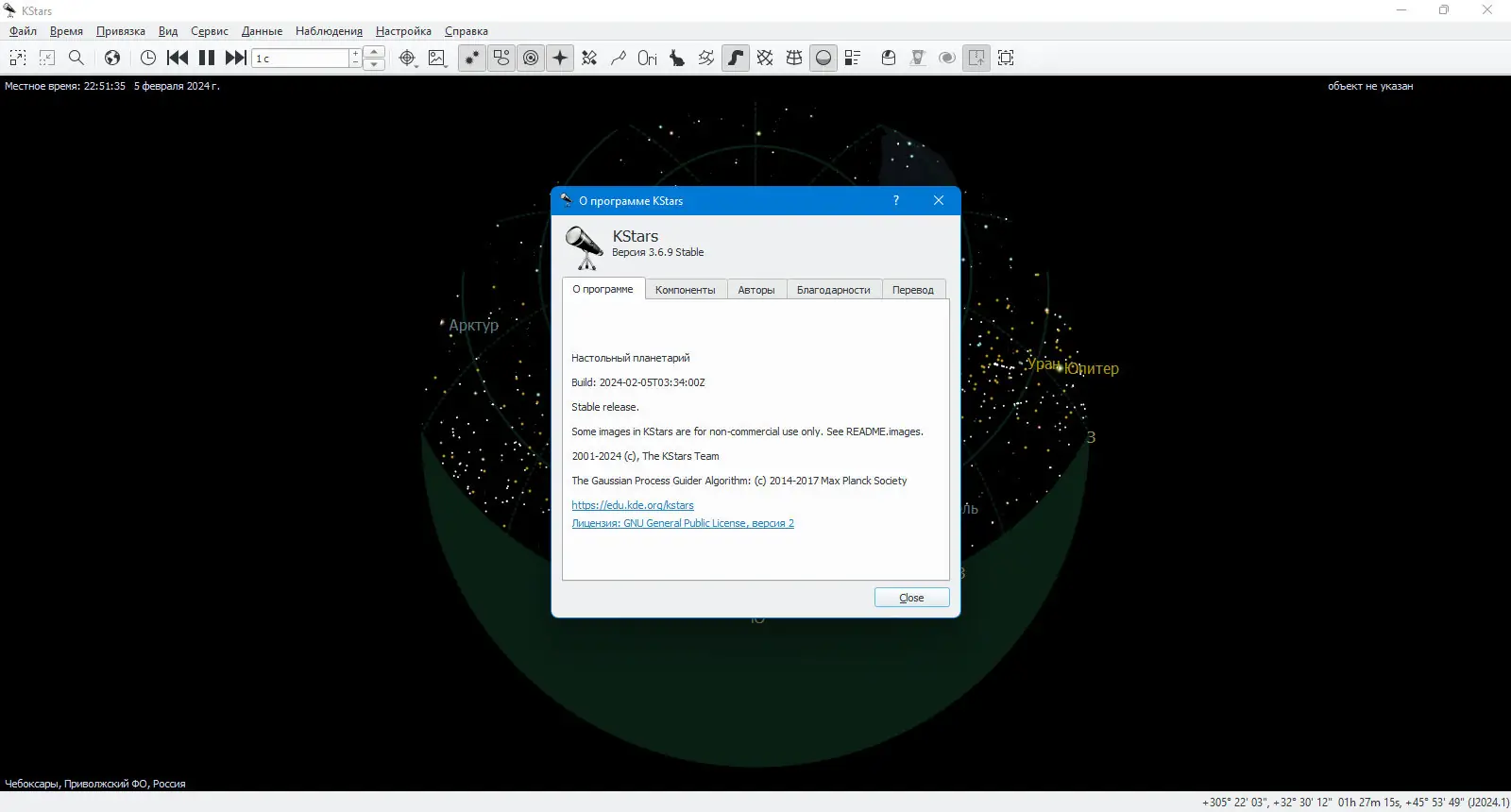 KStars — это бесплатное, с открытым исходным кодом и кроссплатформенное программное обеспечение для астрономии, позволяющее моделировать ночное небо с высокой точностью на любой точке Земли, в любую дату и время.