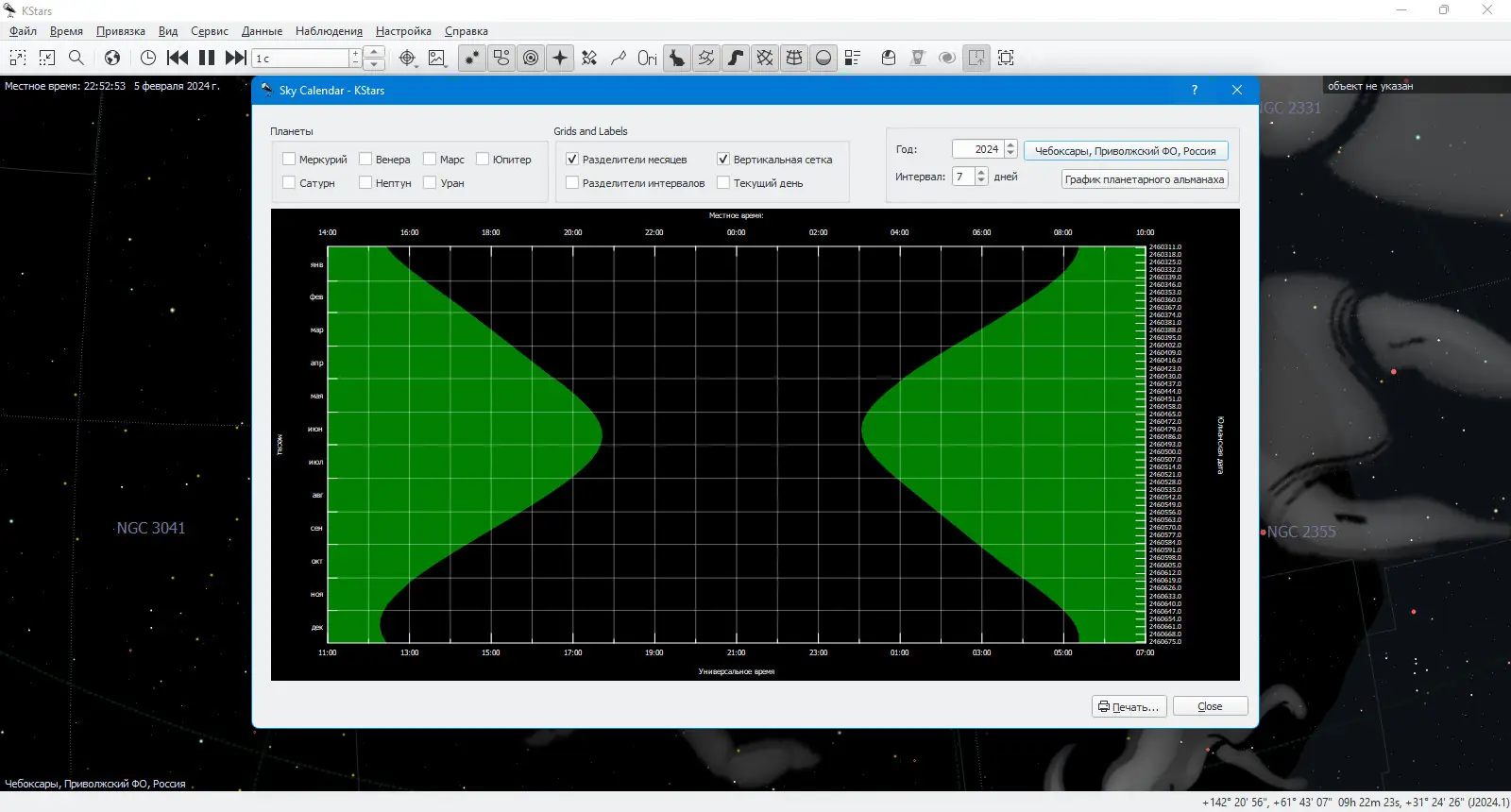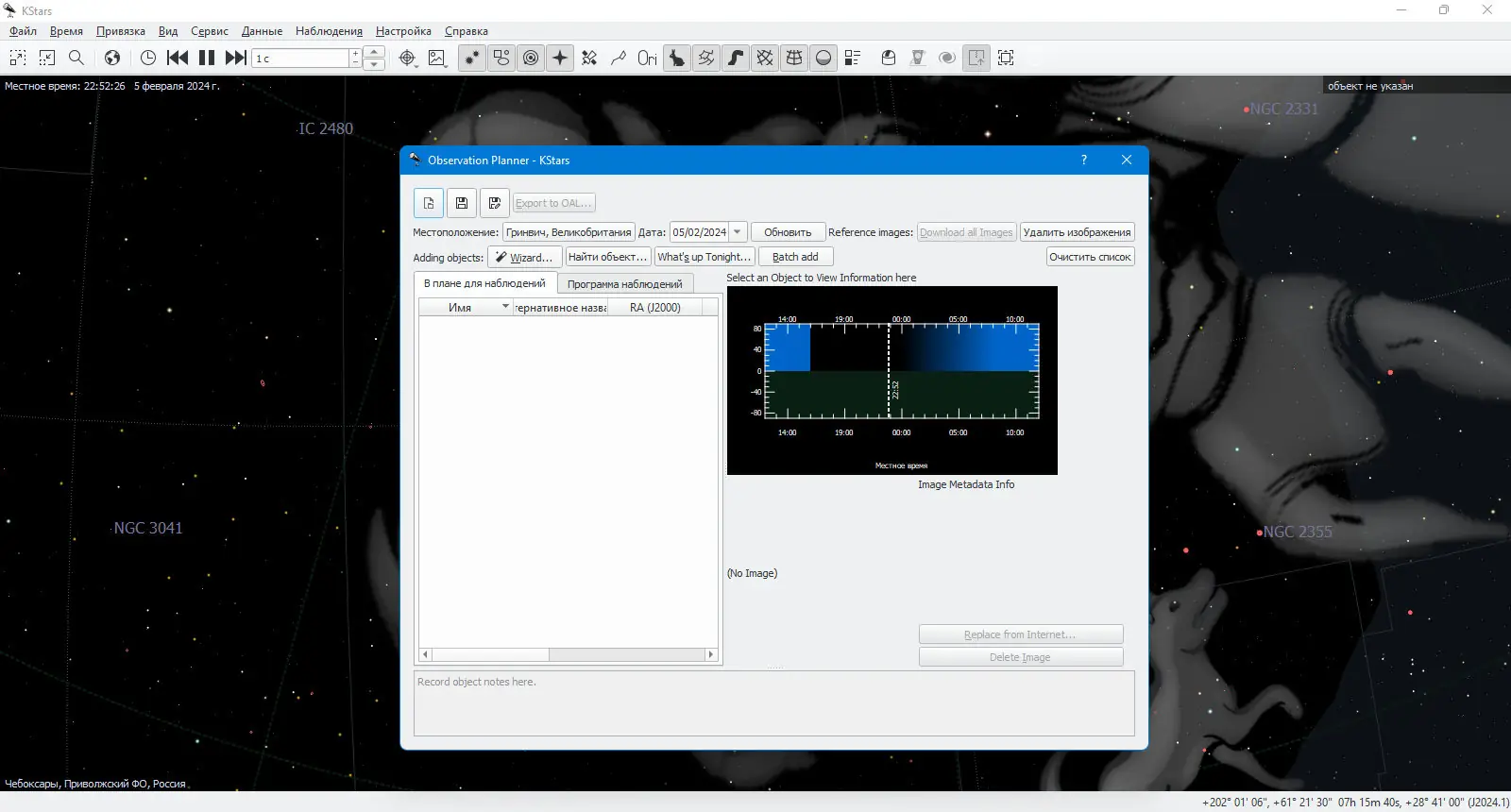 - Планировщик наблюдений с автоматической сортировкой объектов и возможностью экспорта карт неба