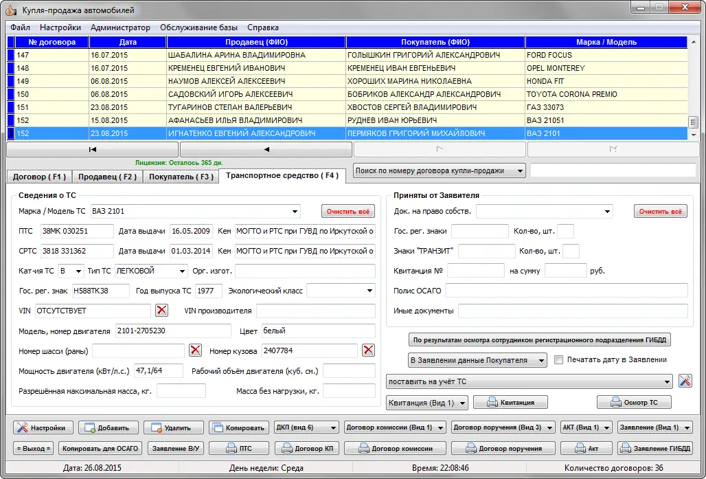 - Печать различных шаблонов договоров купли-продажи ТС и заявлений в ГИБДД.