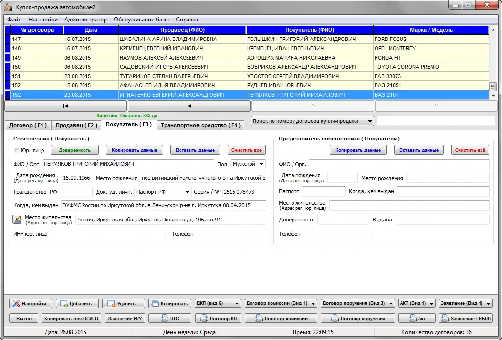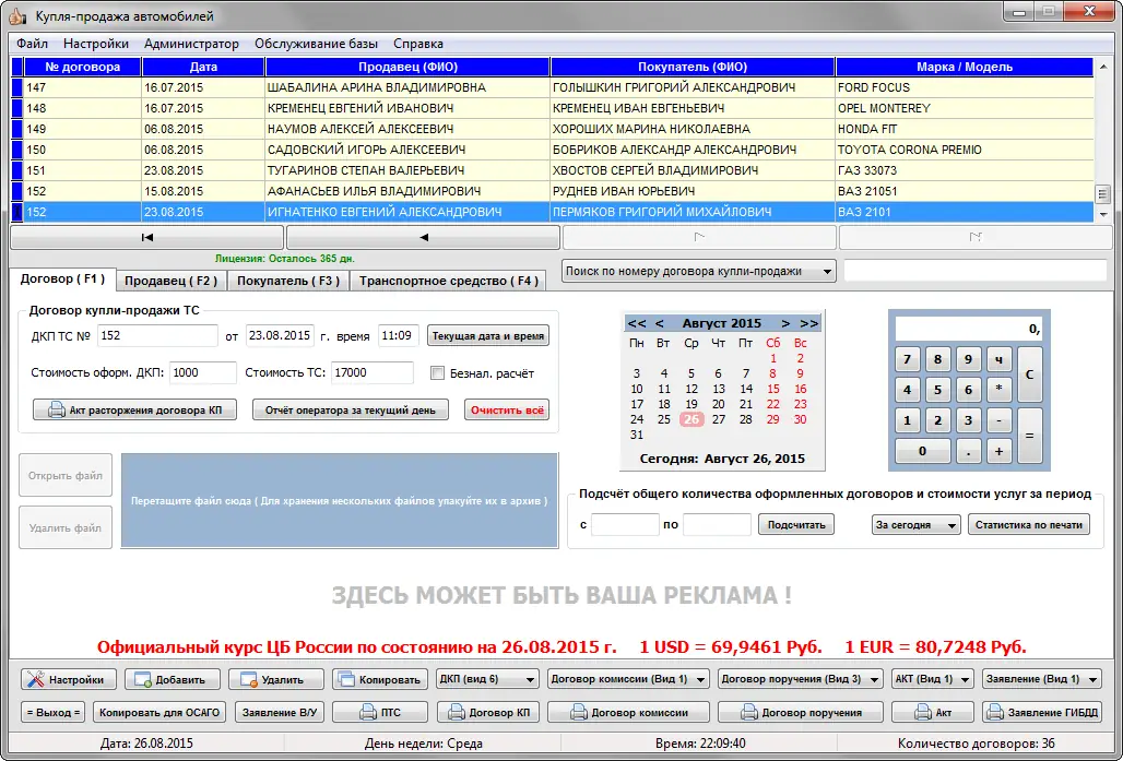 Программа «Купля-продажа автомобилей» создана для автоматизации учета договоров по продаже и оформлению связанных документов. Обеспечивает заполнение и печать бланков договоров, заявлений, актов и квитанций, используемых при оформлении сделок с автотранспортом. Интуитивно понятный интерфейс делает работу удобной и быстрой, а соблюдение нормативных требований и одобрение ГИБДД гарантируют легальность и актуальность используемых документов.