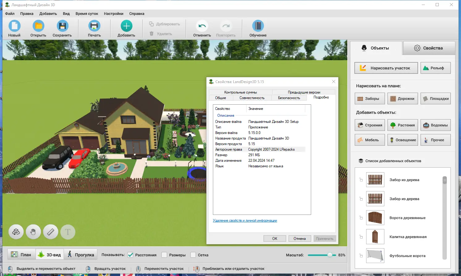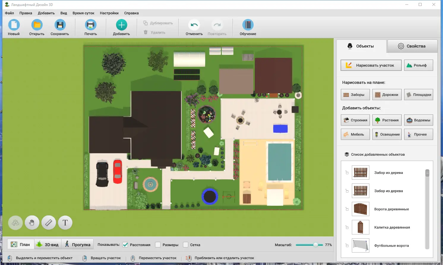 Ландшафтный Дизайн 3D — это простая и удобная программа для планирования приусадебных и дачных участков. Она позволяет создавать проекты любой формы и размера, размещать строительные объекты, растения и мебель, а затем просматривать результаты в 3D. Управление в программе интуитивно понятное и не требует специальных навыков, что делает проектирование похожим на игру — выбираете нужные объекты из каталога, размещаете их на участке и настраиваете параметры. Возможность менять цвета, текстуры и расположение элементов на любом этапе помогает максимально реалистично представить будущий дизайн участка.