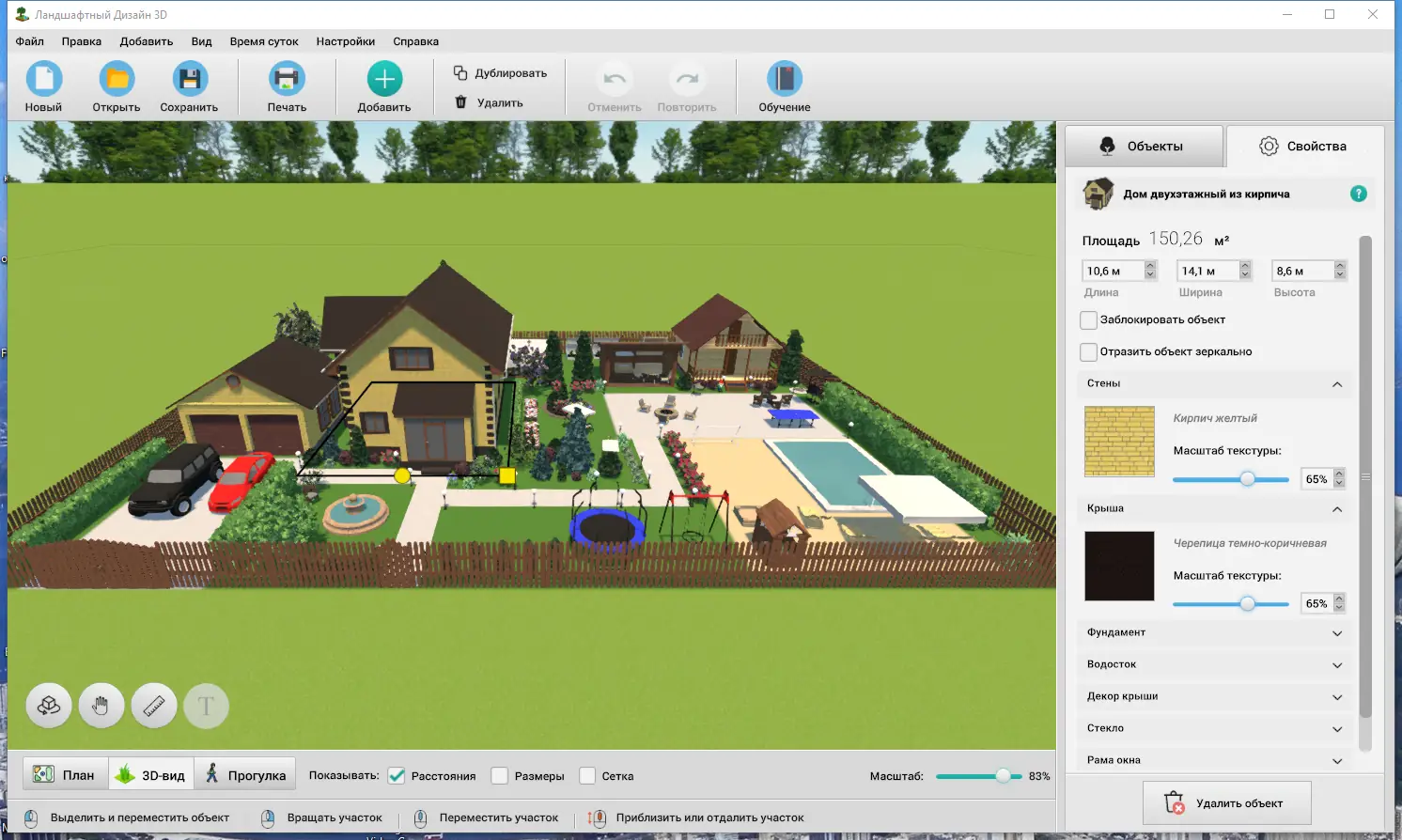 - Возможность построить забор, дорожки из камня, плитки или брусчатки, а также менять их параметры и материалы.