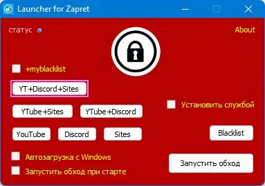 Программа для быстрого запуска утилиты zapret, предназначенная для ускорения доступа к таким сервисам, как YouTube, Discord и другим заблокированным ресурсам.
