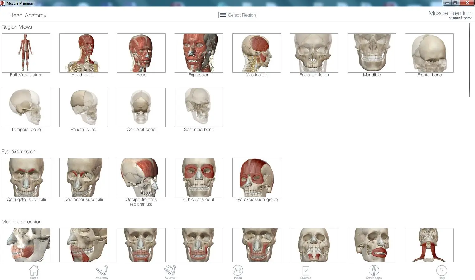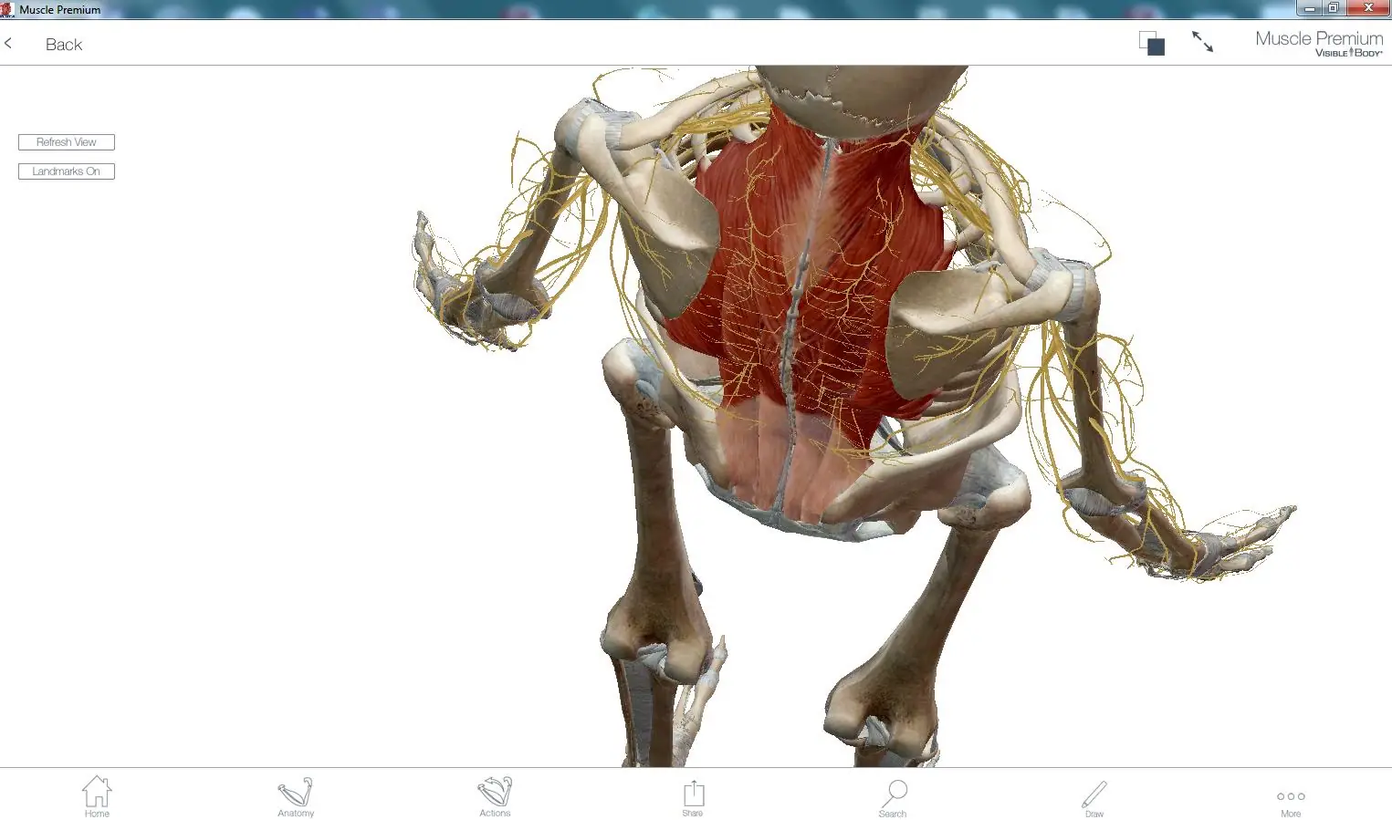 Muscle Premium — это подробное руководство от «Visible Body» в формате 3D, которое помогает понять, как взаимодействуют мышцы и кости, а также как возникают распространённые травмы и патологические состояния. ПО включает в себя реалистичные 3D-модели костей, связок, сумок, а также скелетных мышц с кровоснабжением и иннервацией. В программе представлены как мужская, так и женская системы, что позволяет сравнивать анатомические особенности. Детальные инструкции по каждой мышце включают информацию о кровоснабжении, иннервации, прикреплениях и действиях, что отображается в анимациях для лучшего понимания. Также доступны видеопрезентации экспертов, освещающие такие темы, как разрыв вращательной манжеты, биомеханика тазобедренного сустава и остеоартрит. Особое внимание уделено распространённым травмам и состояниям опорно-двигательного аппарата — от шейного спондилеза до синдрома запястного канала и ишиаса, с возможностью изучения различий с нормальной анатомией. В программе есть обширная база тестов, включающая более 1000 вопросов, для оценки усвоенных знаний и мастерства.