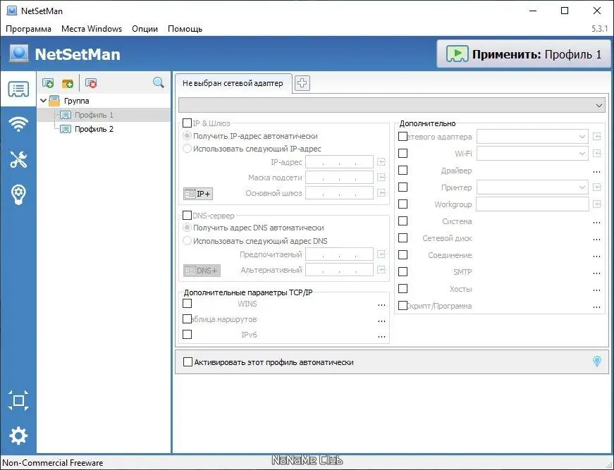 NetSetMan представляет собой программу, которая упрощает настройку и быстрое переключение сетевых параметров. Всего можно создать до шести профилей, каждый из которых содержит индивидуальные настройки IP-адреса, маски подсети, DNS, WINS, имени компьютера, рабочей группы, а также параметры для сетевых дисков и принтеров. Возможность экспорта и импорта профилей позволяет легко переносить настройки между машинами или сохранять их для резервного копирования.