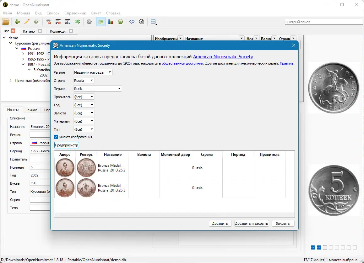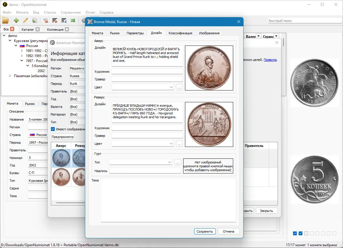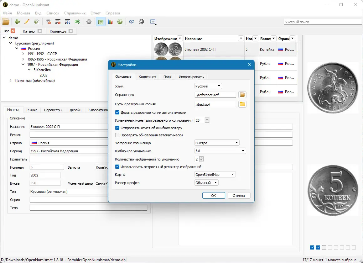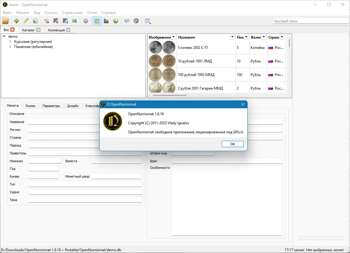 OpenNumismat — это удобное и надежное приложение для коллекционеров монет, предназначенное для организации, хранения и анализа нумизматической коллекции. Программа позволяет создавать детальные каталоги, управлять списками нужных и проданных монет, а также получать статистические данные по коллекции.