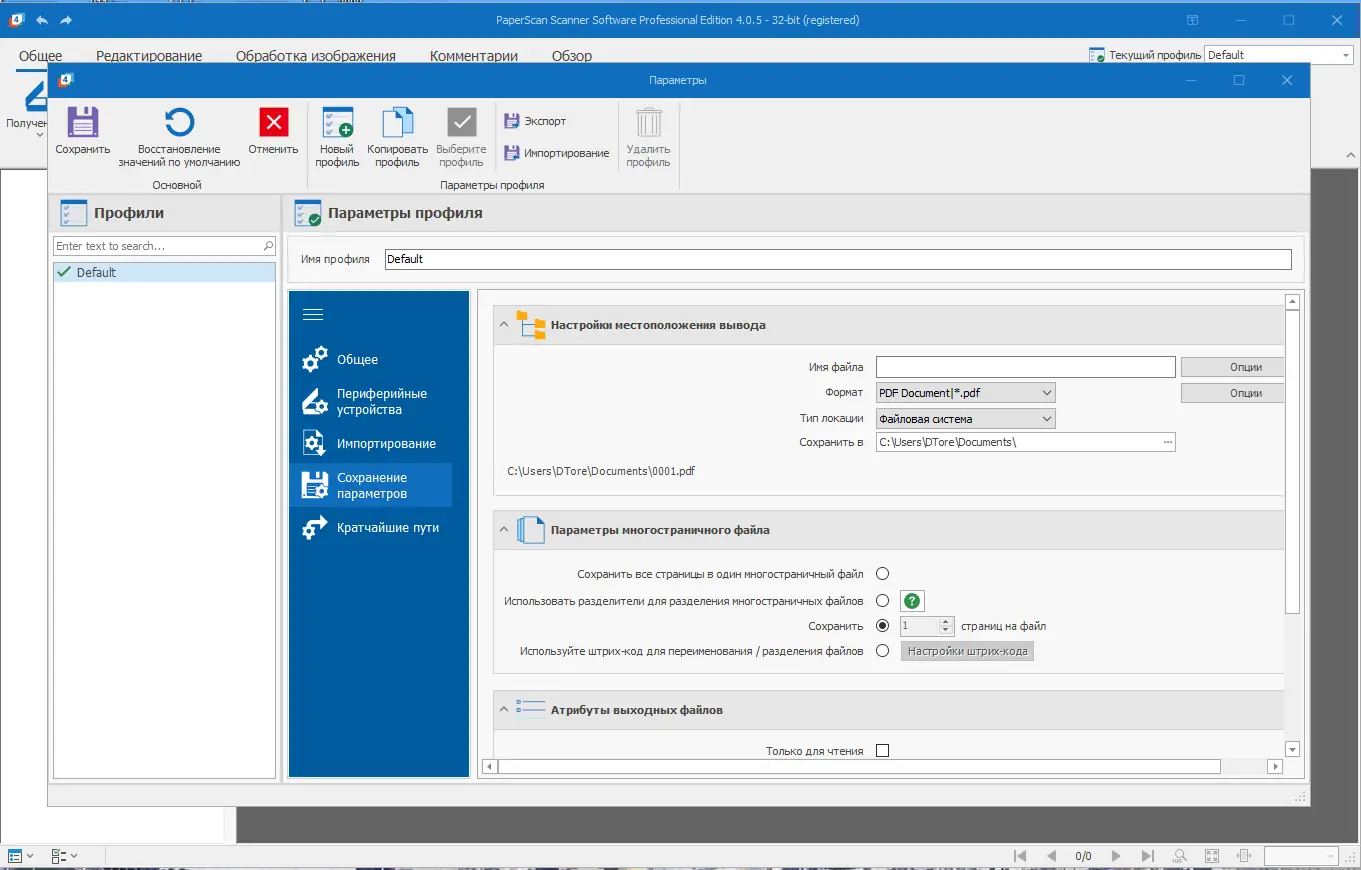 - Сохранение в форматах JPEG, TIFF, PDF, JBIG2 и других, с возможностью создания многостраничных файлов.