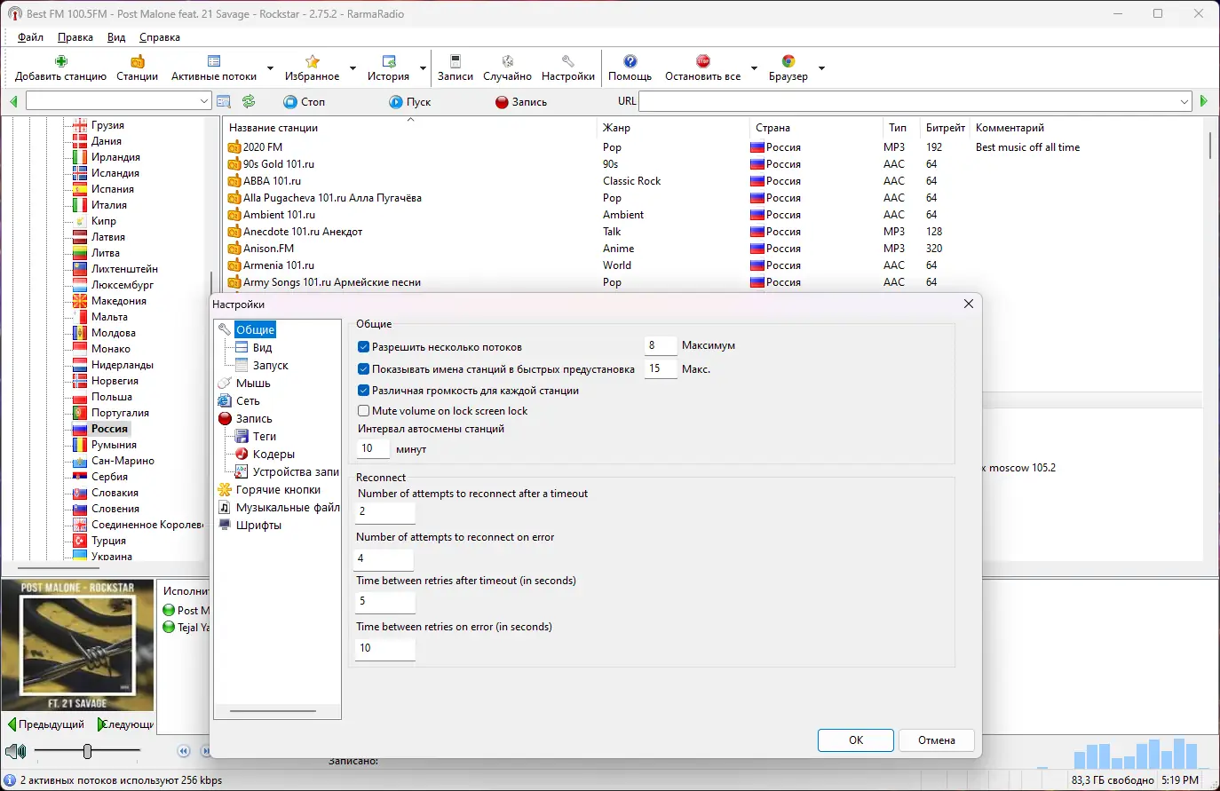 - Интеграция с Winamp и возможность добавлять собственные станции