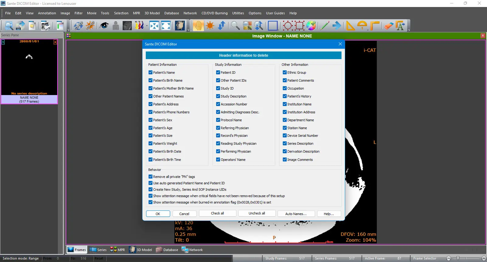 - Редактирование и изменение атрибутов DICOM, включая последовательности.