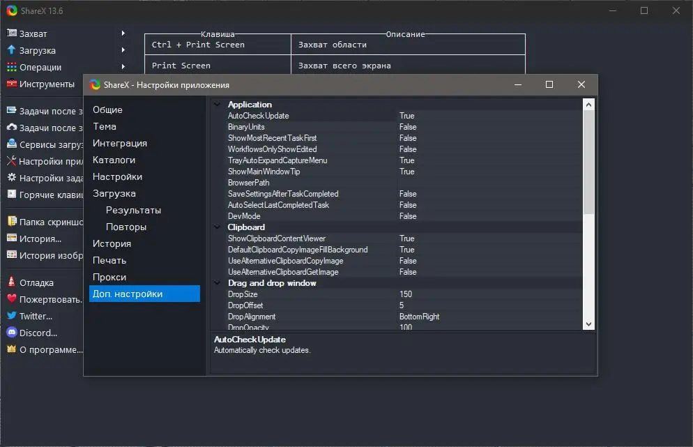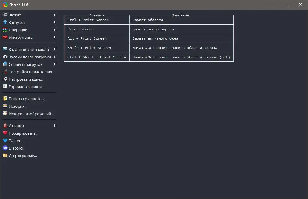 ShareX — это универсальный инструмент для снятия скриншотов и записи видео с экрана, обладающий широкими функциональными возможностями. Он позволяет делать скриншоты всего экрана, выбранной области или даже произвольной фигуры. Пользователь может сразу же после съемки применять редактирование, добавлять водяные знаки, тень или аннотации, а также сохранять или автоматически загружать изображения на популярные облачные и социальные сервисы. Встроенные инструменты и настройка горячих клавиш делают работу максимально удобной, а поддержка расширенных функций, таких как запись звука или видео, значительно расширяет спектр использования приложения.