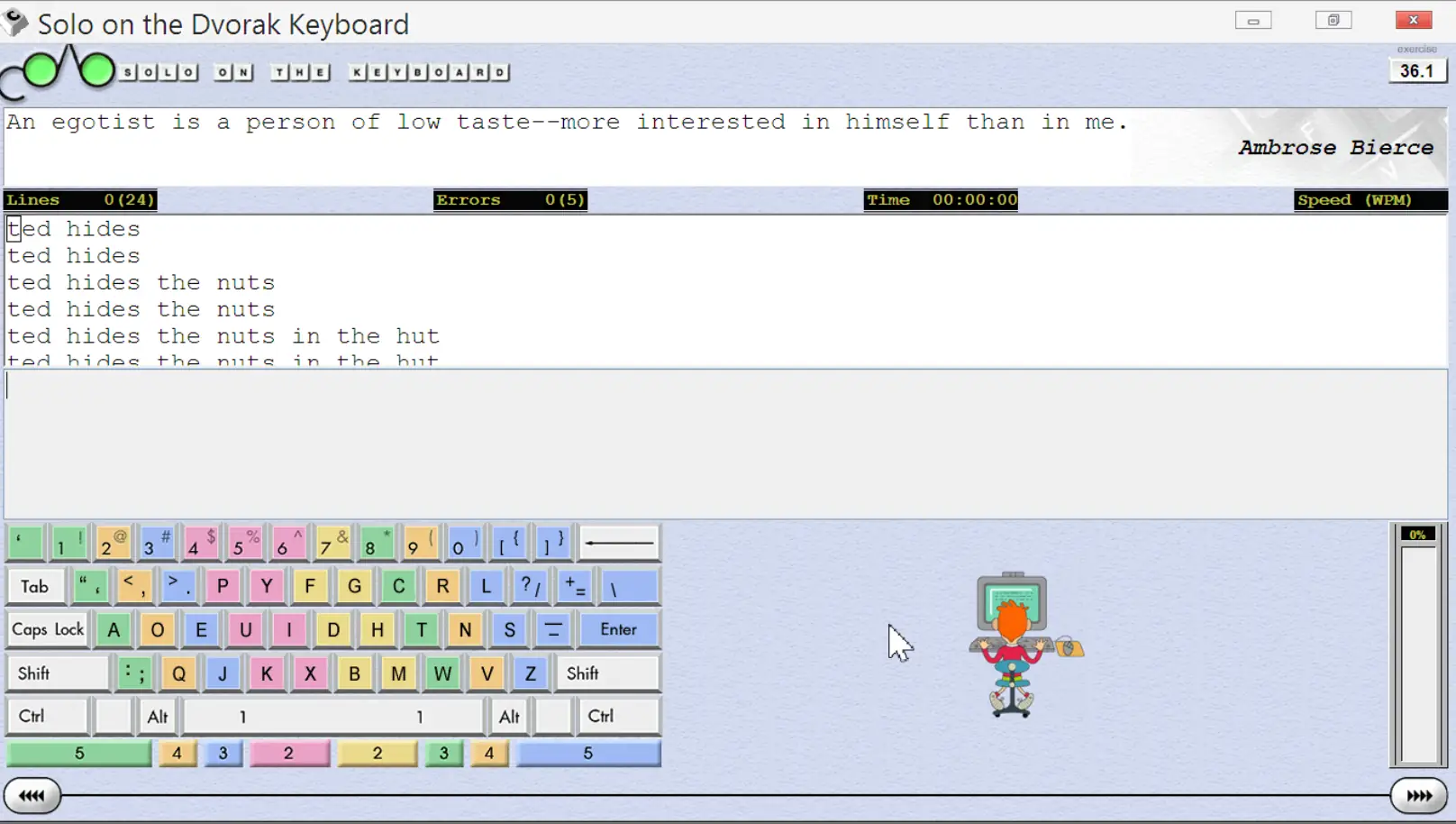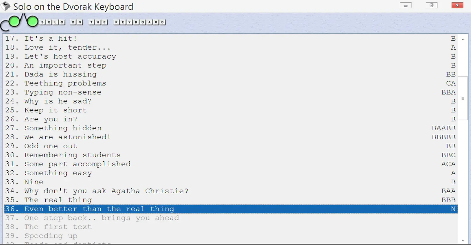Обучающая программа «Solo on Dvorak Keyboard» предназначена для тех, кто уже знает о преимуществах слепой десятипальцевой печати и хочет освоить раскладку Dvorak для повышения эффективности работы на клавиатуре.