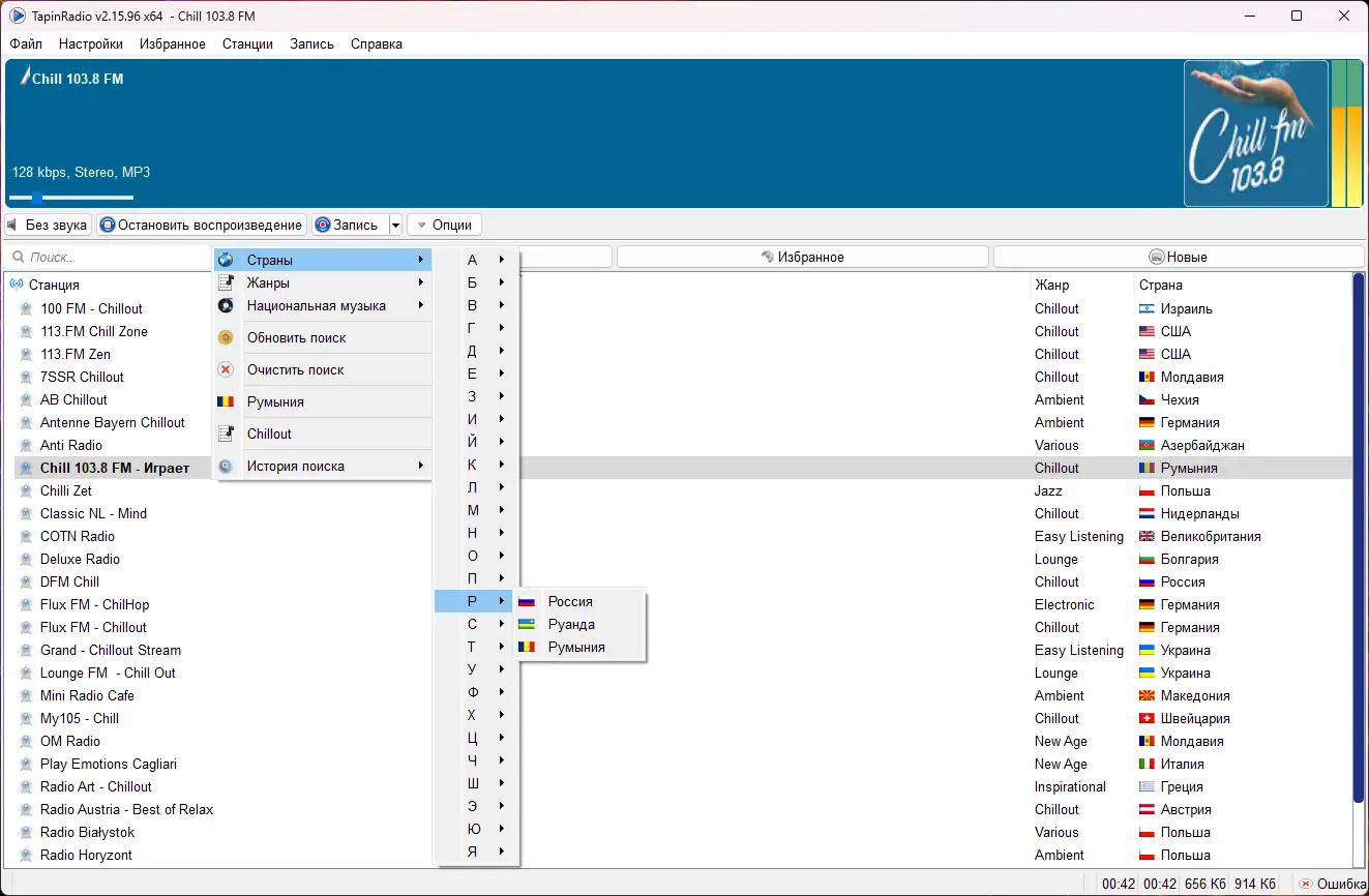 - Группировка станций по жанрам, странам и материкам для быстрого поиска