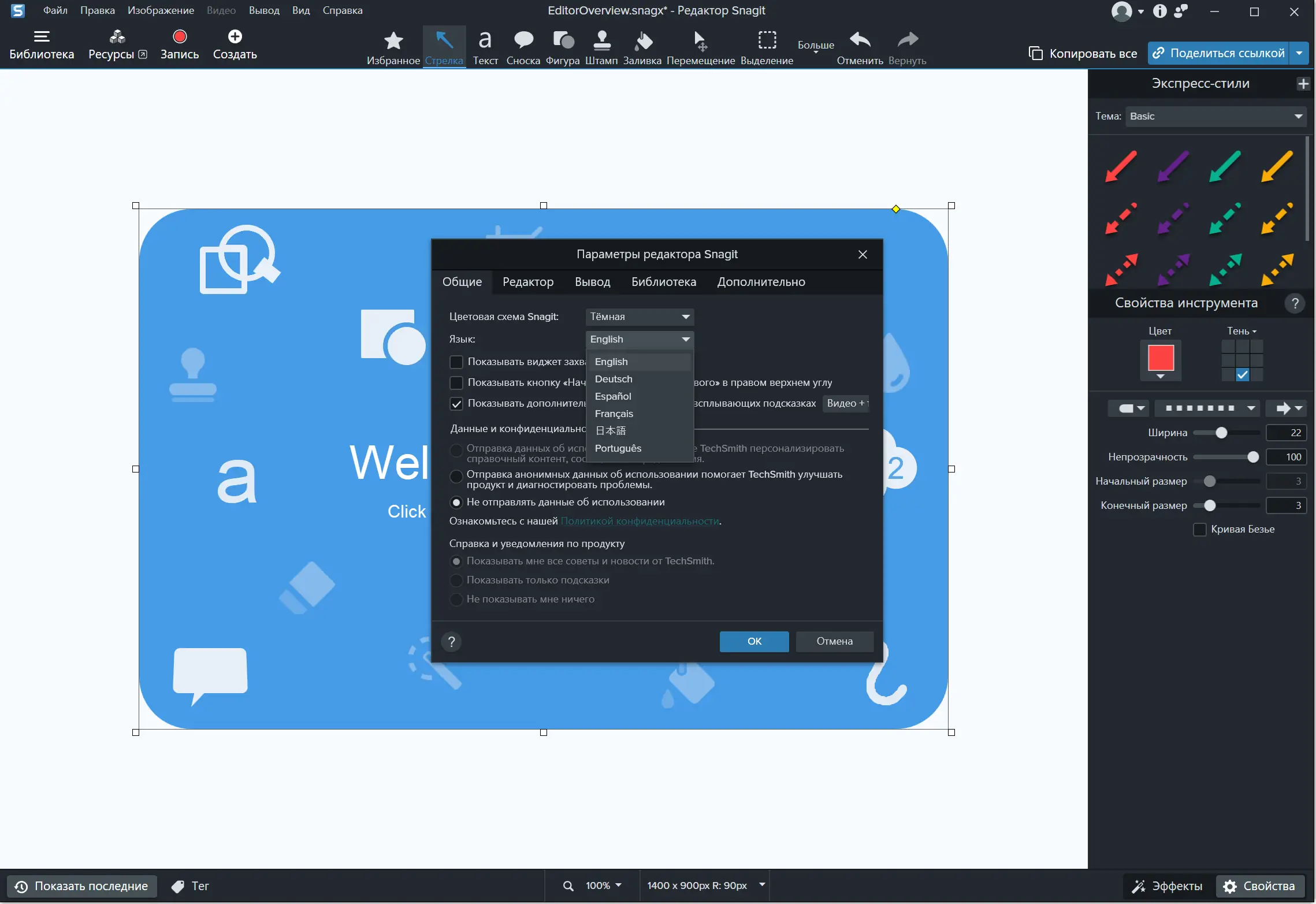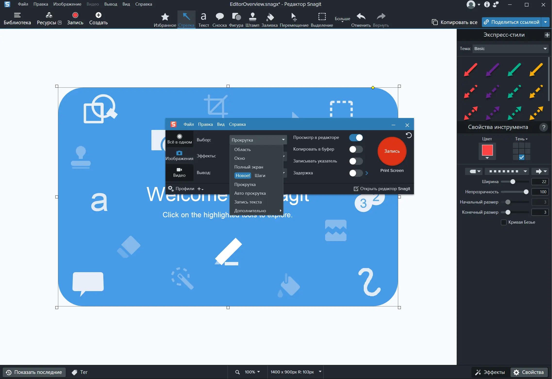 - Редактирование изображений с помощью встроенного редактора SnagIt Editor: добавление текста, фигур, стрелок, изменение размеров, вращение и обрезка