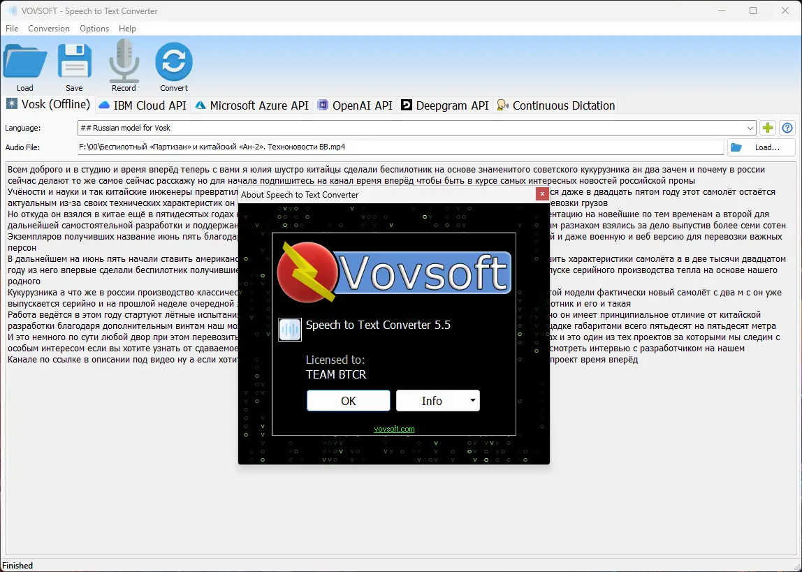 Vovsoft Speech to Text Converter — это эффективное программное обеспечение для автоматического преобразования речи в текст. Поддерживая более 50 языков, оно идеально подходит для транскрипции интервью, встреч, подкастов и любых аудиофайлов, экономя ваше время и усилия.