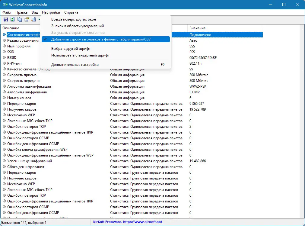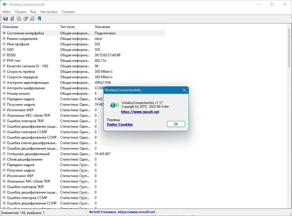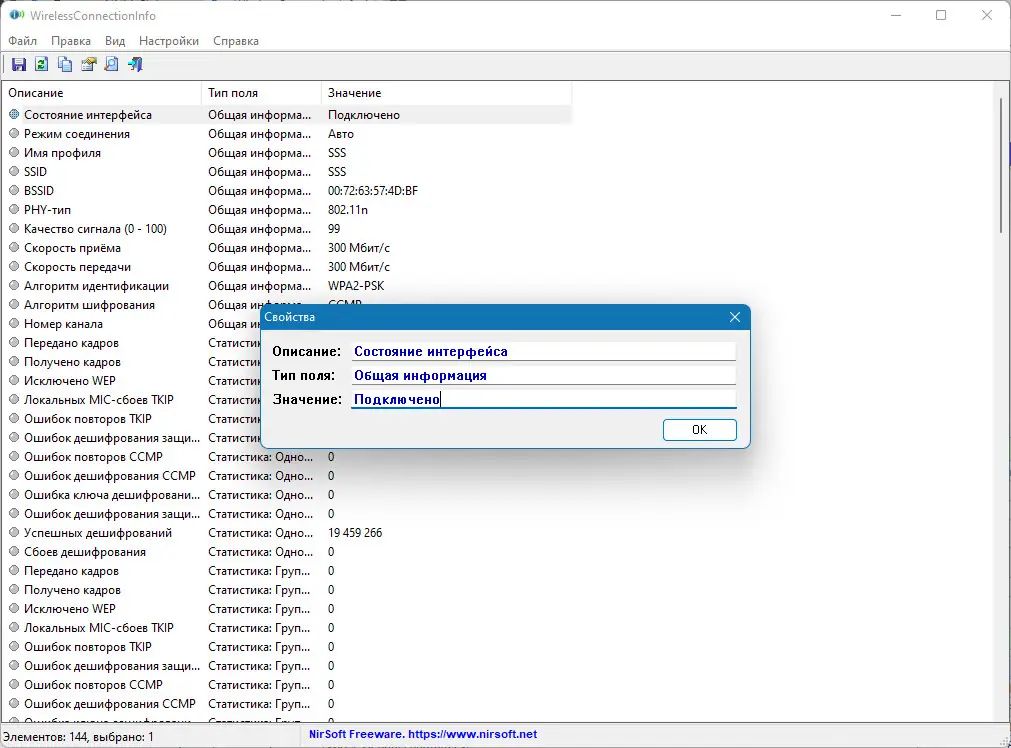 WirelessConnectionInfo — это удобная утилита для отображения полной информации и статистики о текущем соединении Wi-Fi. Она работает без установки и предоставит вам все необходимые данные о качестве и характеристиках вашей сети.
