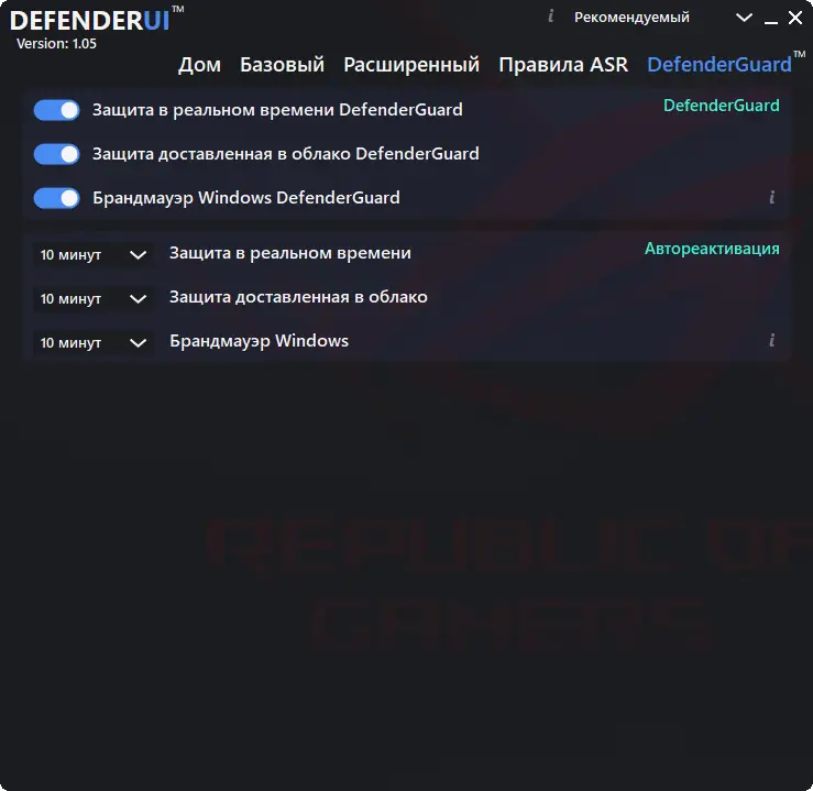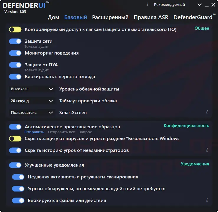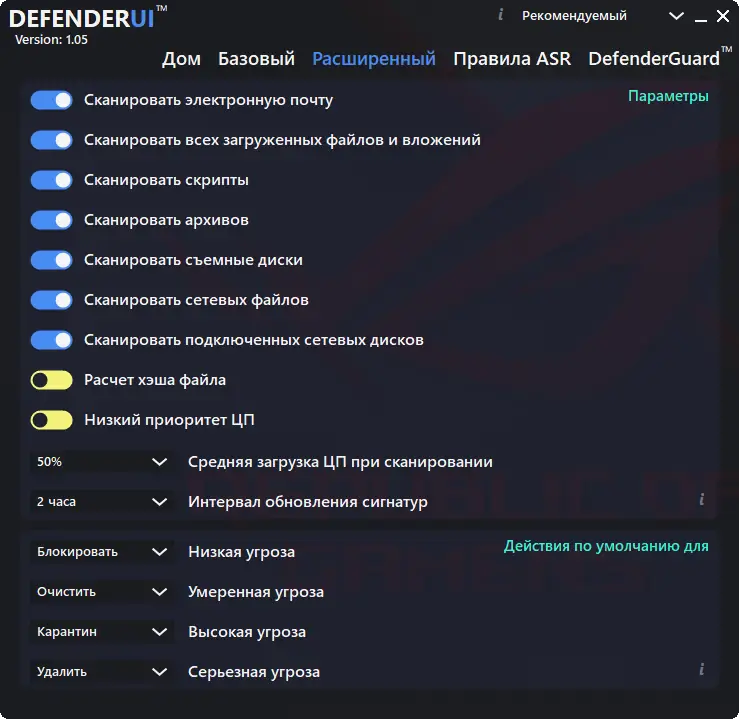 DefenderUI представляет собой удобное решение для пользователей, желающих иметь полный контроль над настройками антивируса Windows. В отличие от стандартного интерфейса, распределённого по разным страницам, программа объединяет все параметры в одном простом и интуитивно понятном окне. Это позволяет быстро производить нужные изменения, управлять исключениями, обновлять базы данных и включать или отключать защитные функции в реальном времени. Благодаря наличию четырёх предустановленных профилей — рекомендуемого, интерактивного, агрессивного и профиль с настройками по умолчанию — пользователь может сразу выбрать оптимальный уровень защиты по своему вкусу и потребностям.