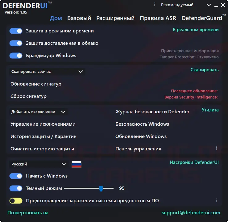 DefenderUI — бесплатная программа, которая служит альтернативной графической оболочкой для настройки антивируса «Безопасность Windows». Этот инструмент позволяет легко управлять всеми аспектами защиты, включая изменение настроек безопасности и поведения встроенного антивируса, а также открывает скрытые функции Microsoft Defender.